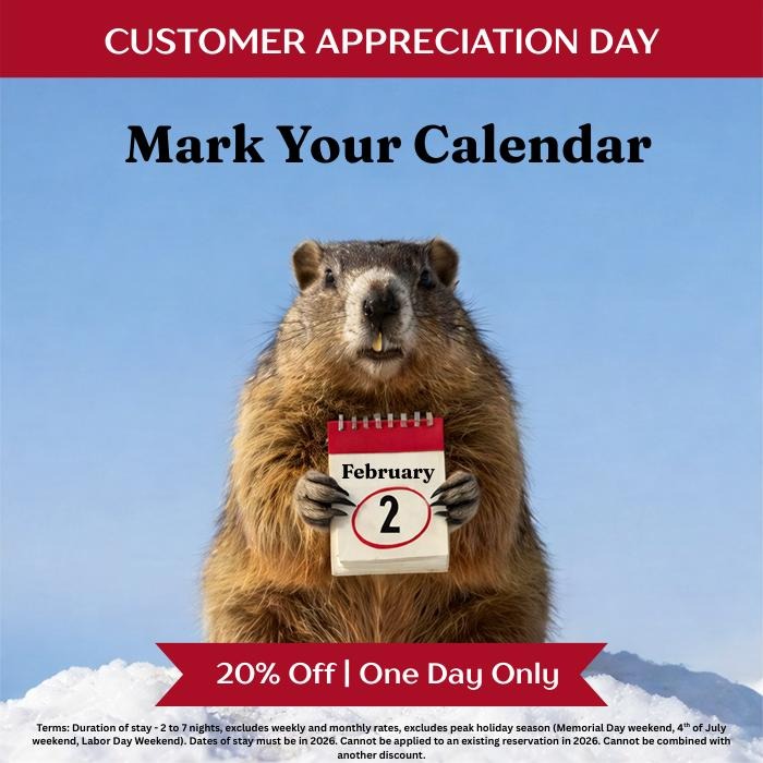 Why wait for spring to start dreaming of the river? To celebrate our amazing guests, we’re hosting our Annual Customer Appreciation Sale on February 2nd only. Whether he sees his shadow or not, you’ll be seeing 20% savings on your next 2-to-7 night getaway. Don’t stay in hibernation—mark your calendar, scout your favorite home, and get ready to book when the sun rises on Groundhog Day! The exclusive promo code for this one-day sale will be revealed right here on February 2nd.