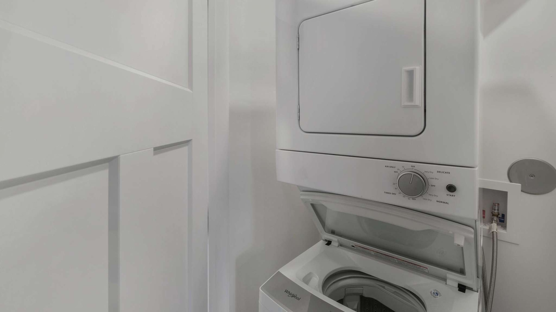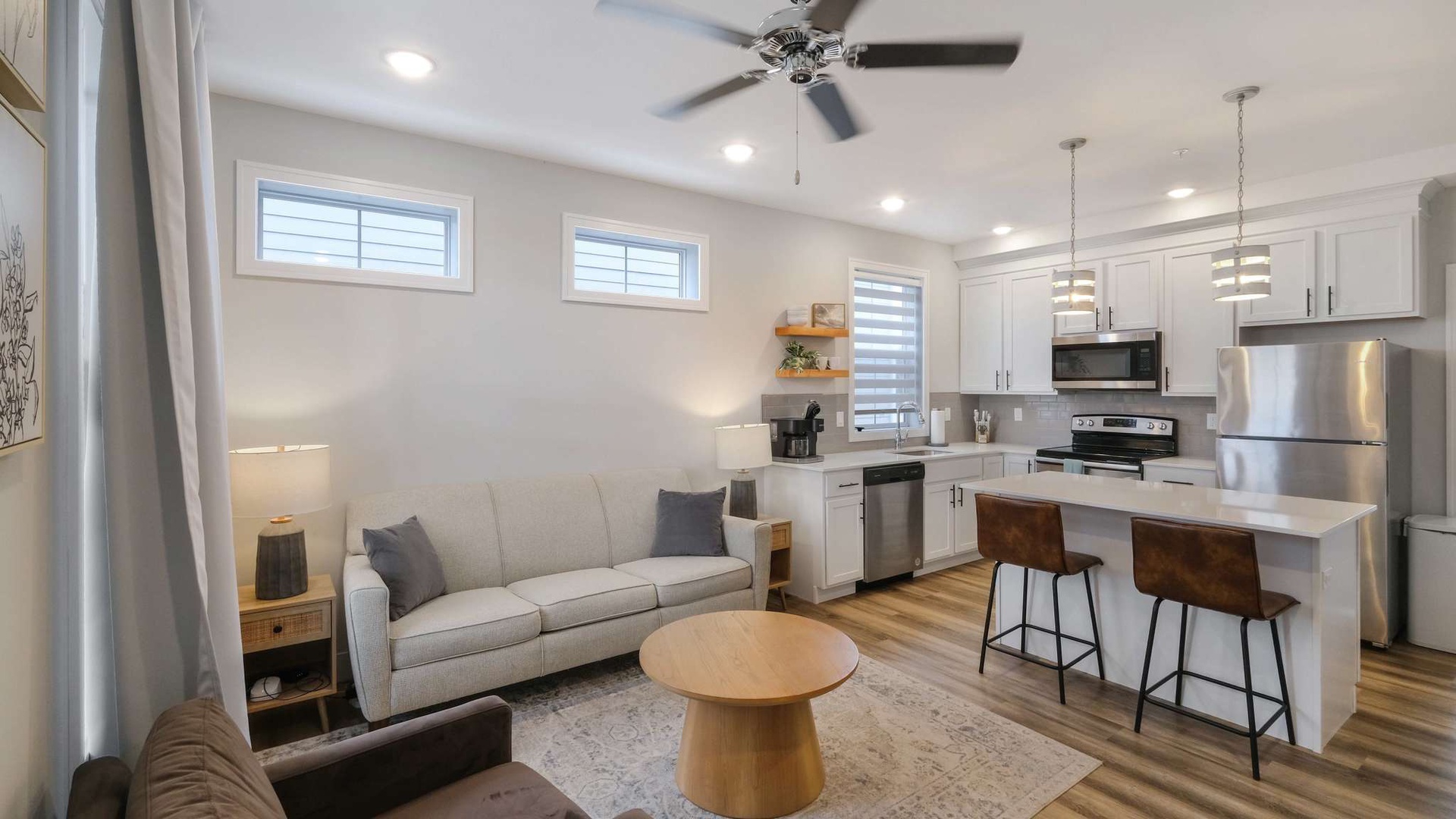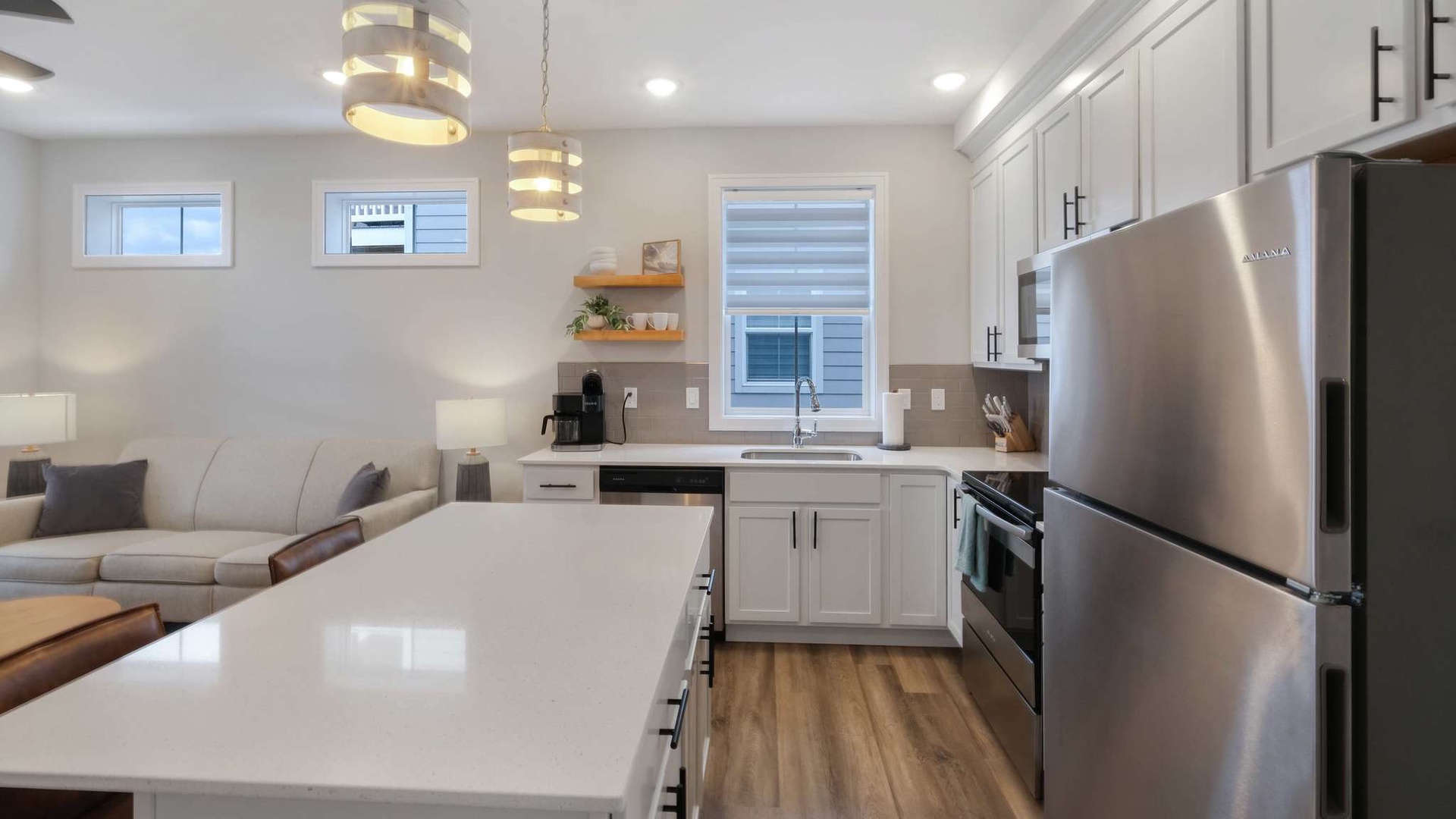 The bright, open-concept main floor includes a living room with a sleeper sofa, a fully equipped kitchen, and a full bathroom. The primary bedroom features a queen-sized bed and walk-in closet, and the in-unit laundry means packing light is easy.