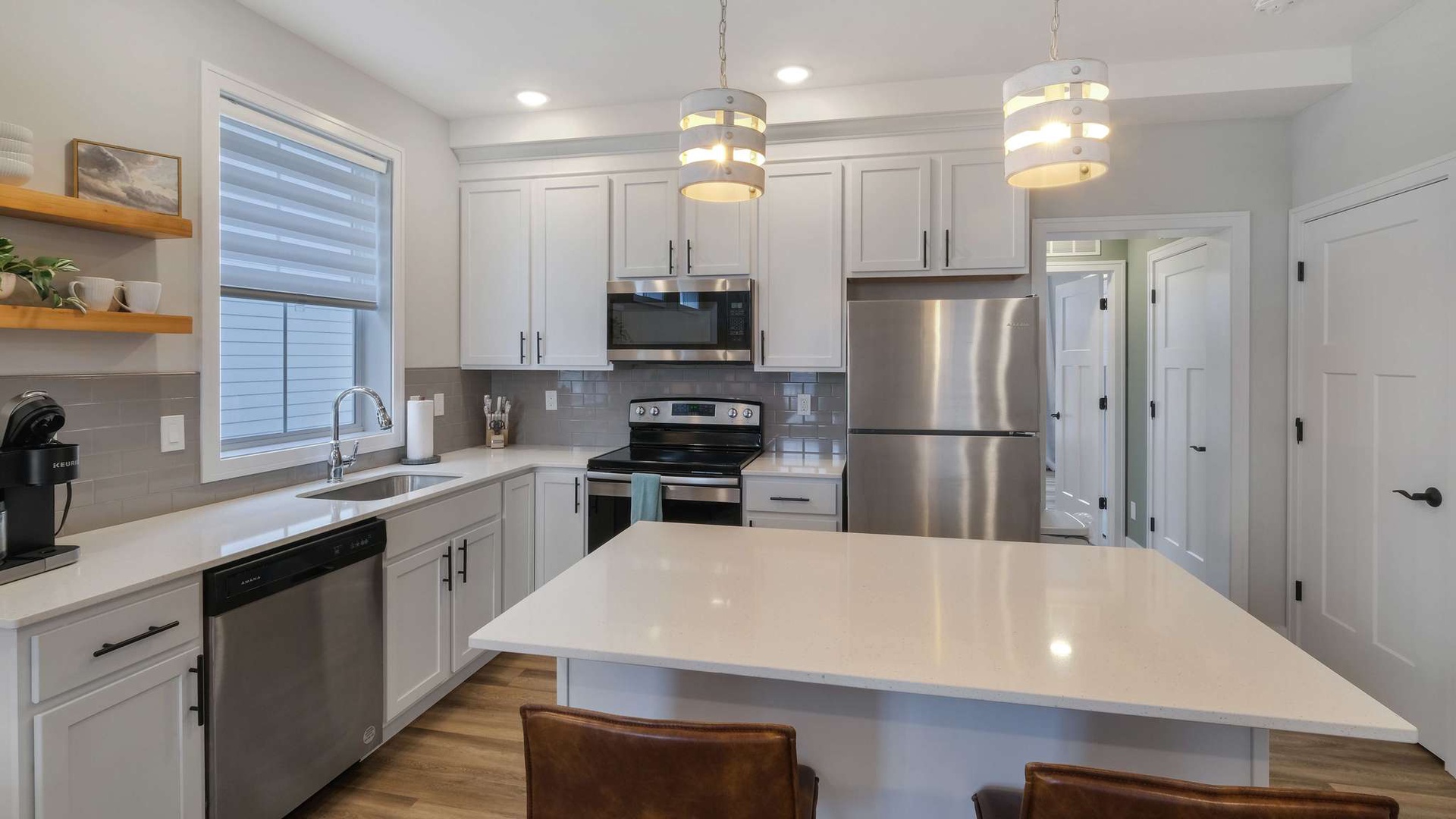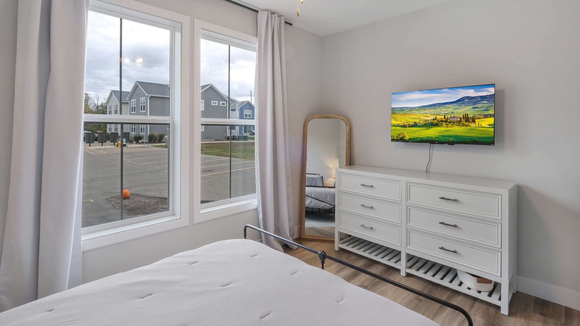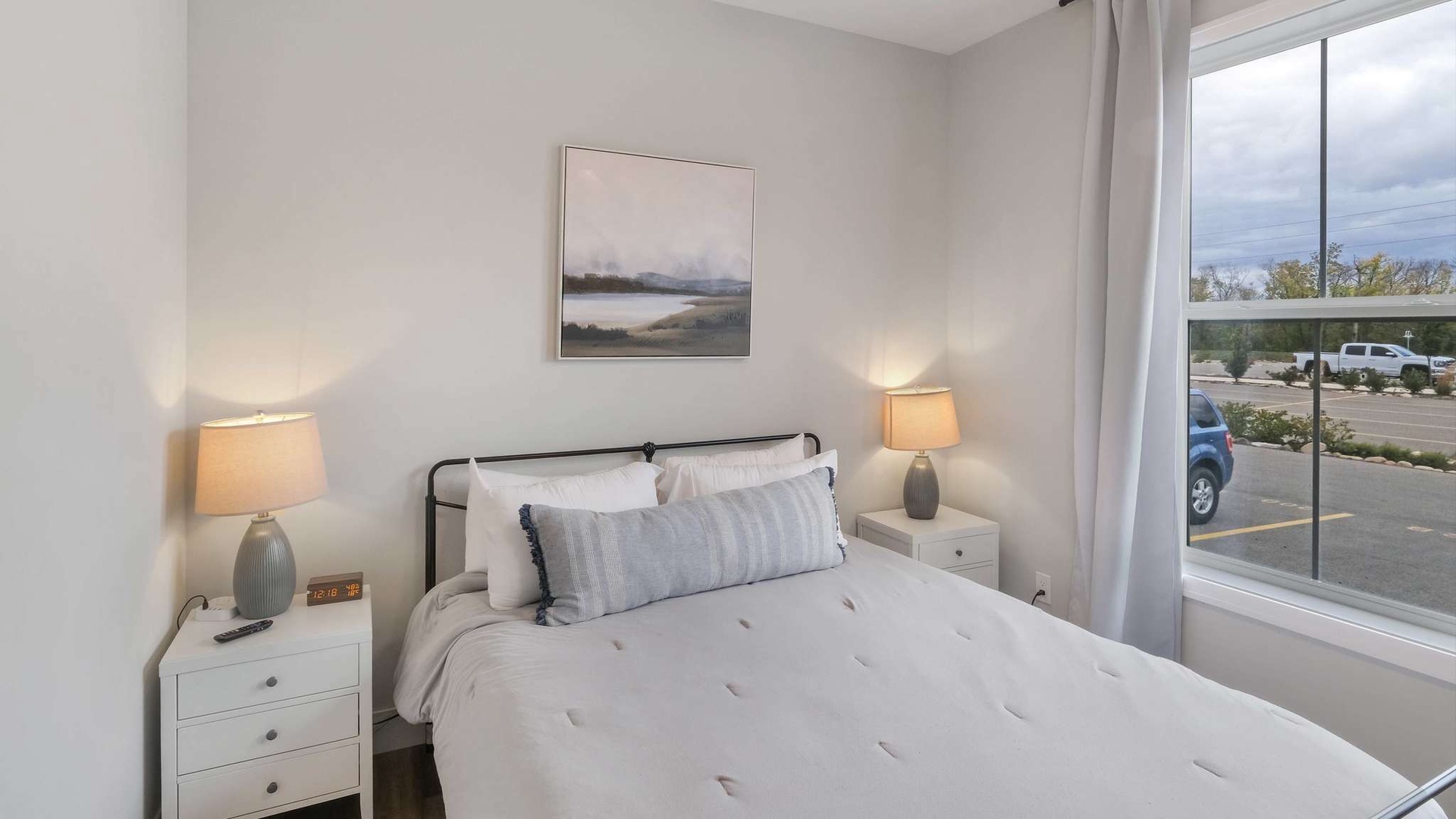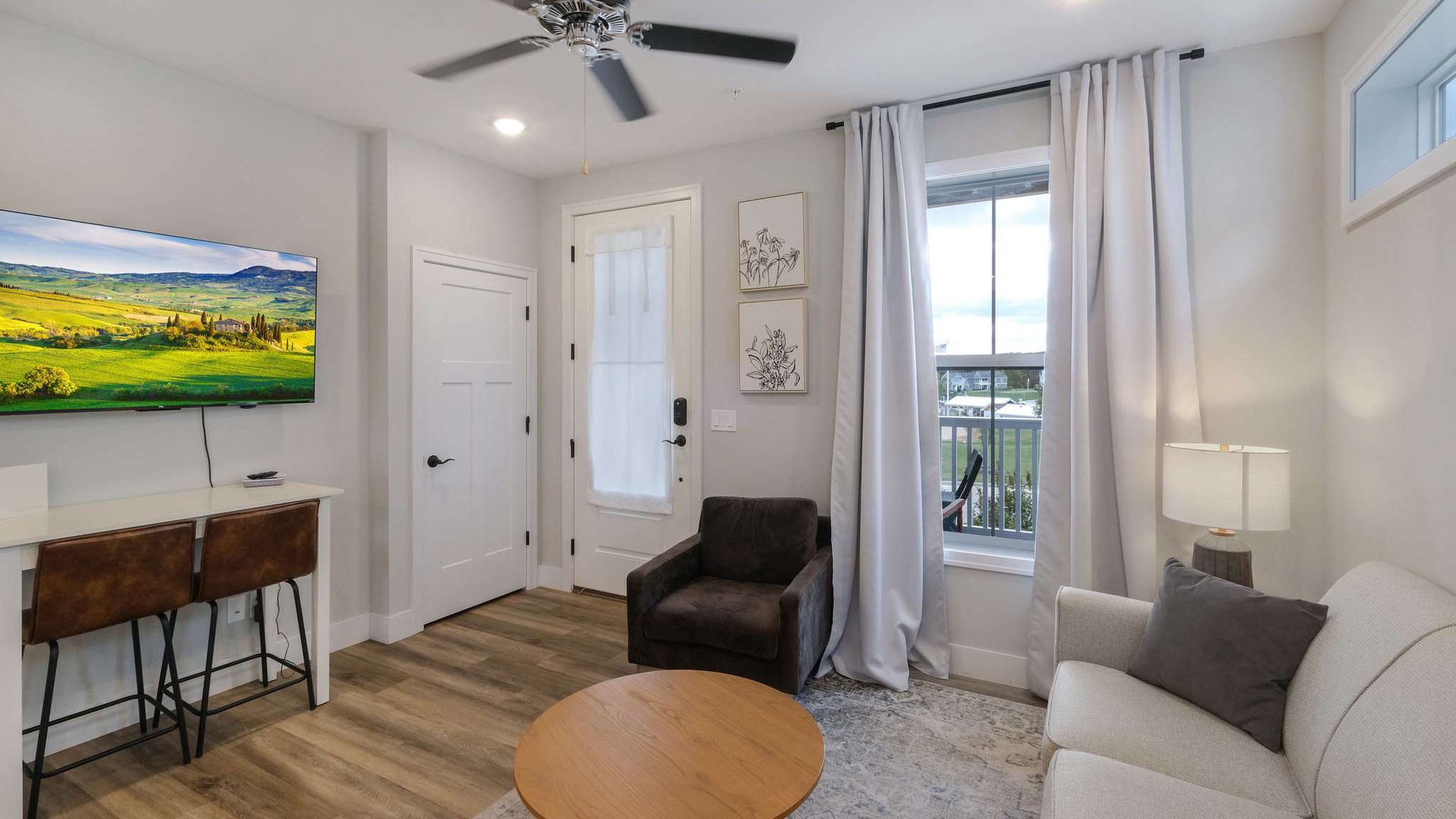 The bright, open-concept main floor includes a living room with a sleeper sofa, a fully equipped kitchen, and a full bathroom. The primary bedroom features a queen-sized bed and walk-in closet, and the in-unit laundry means packing light is easy.