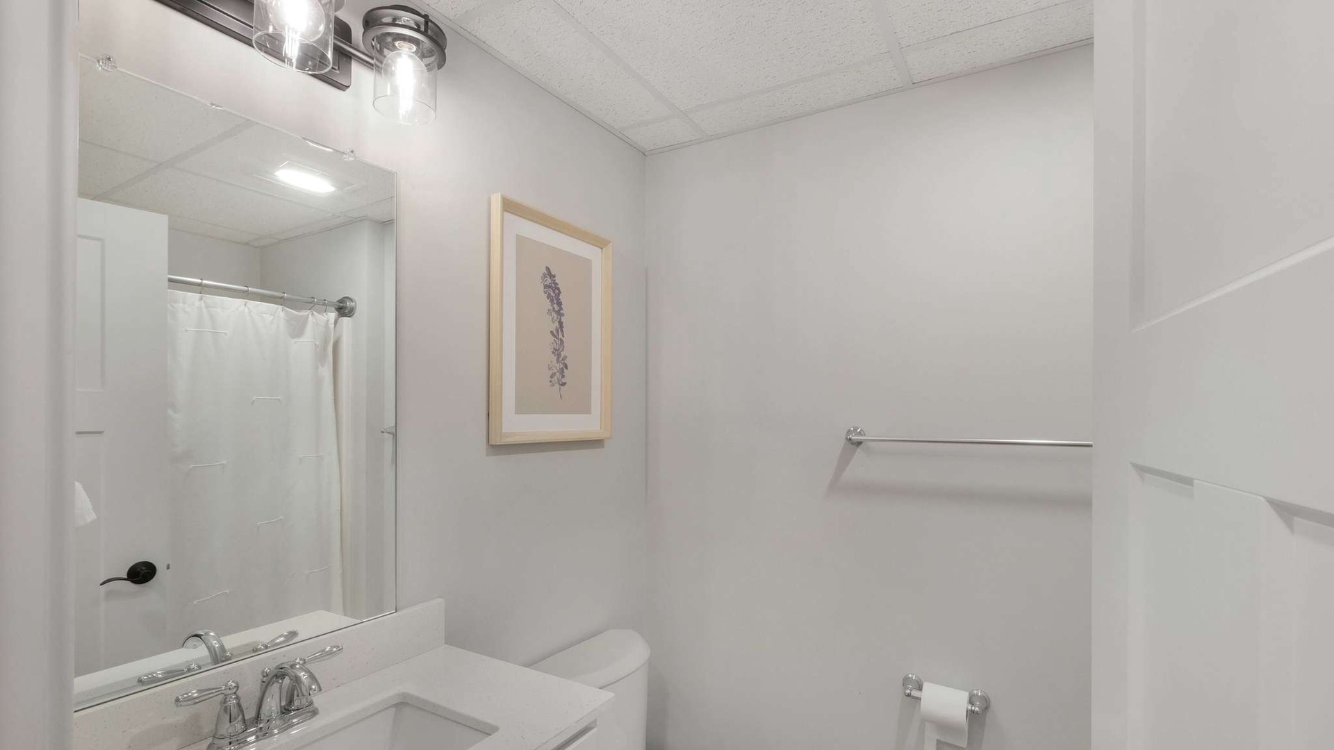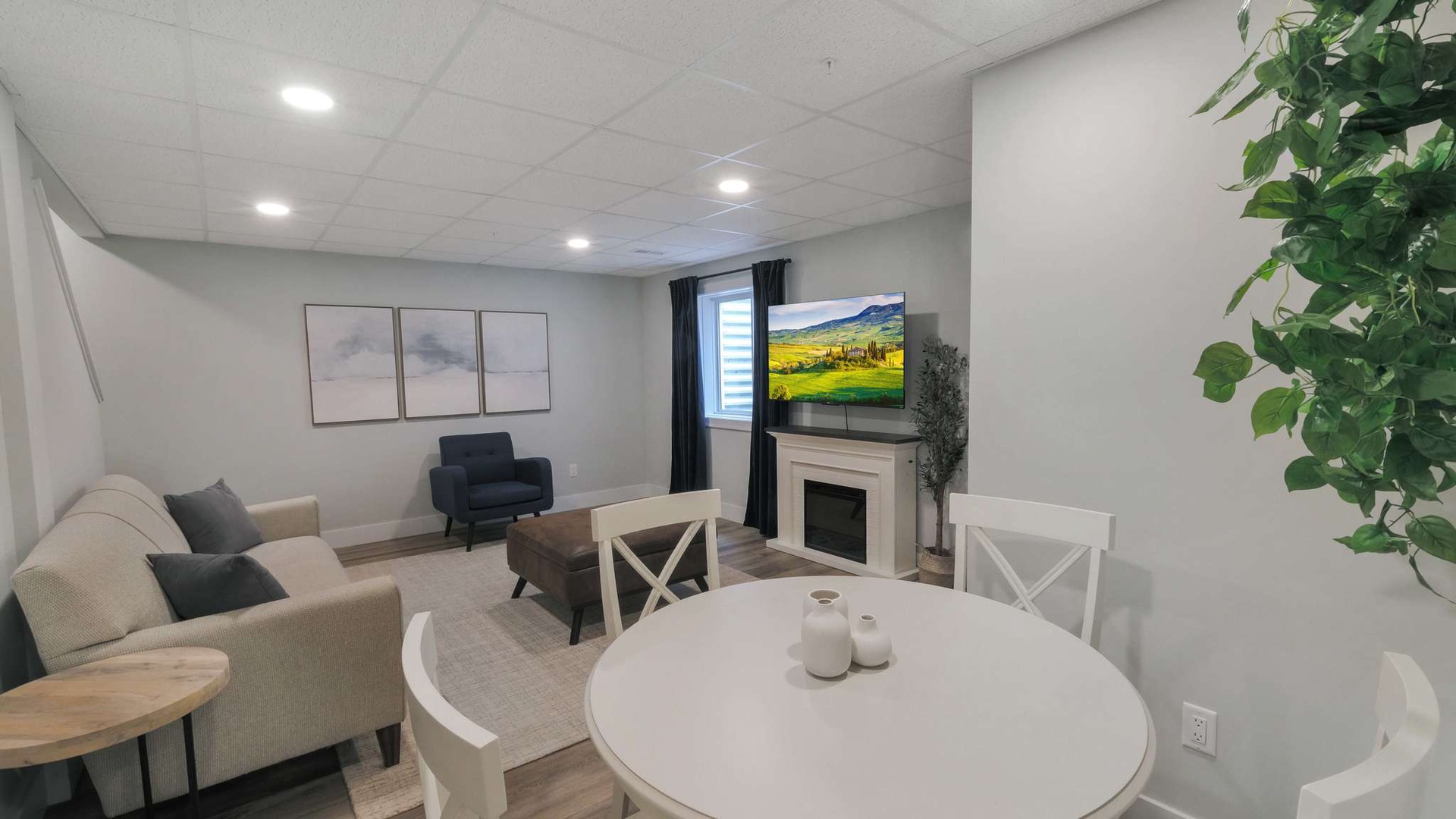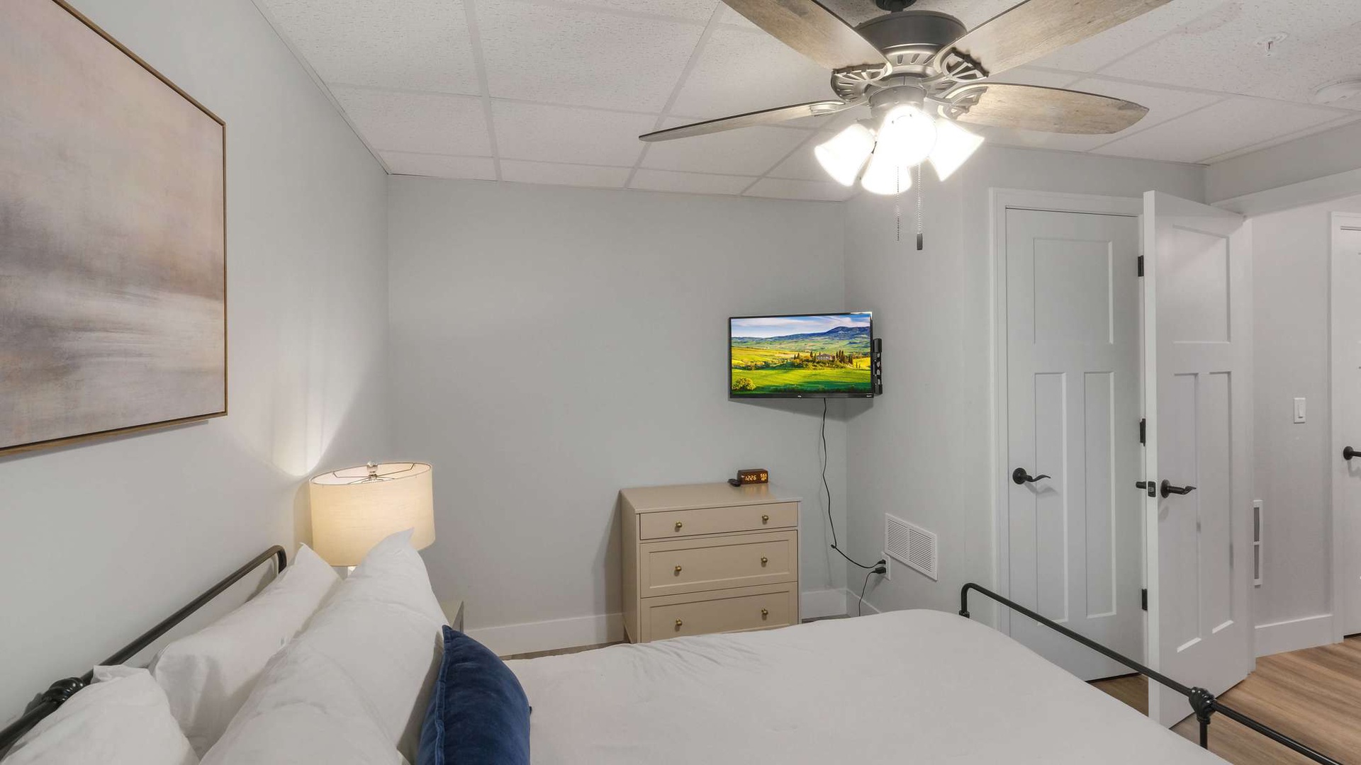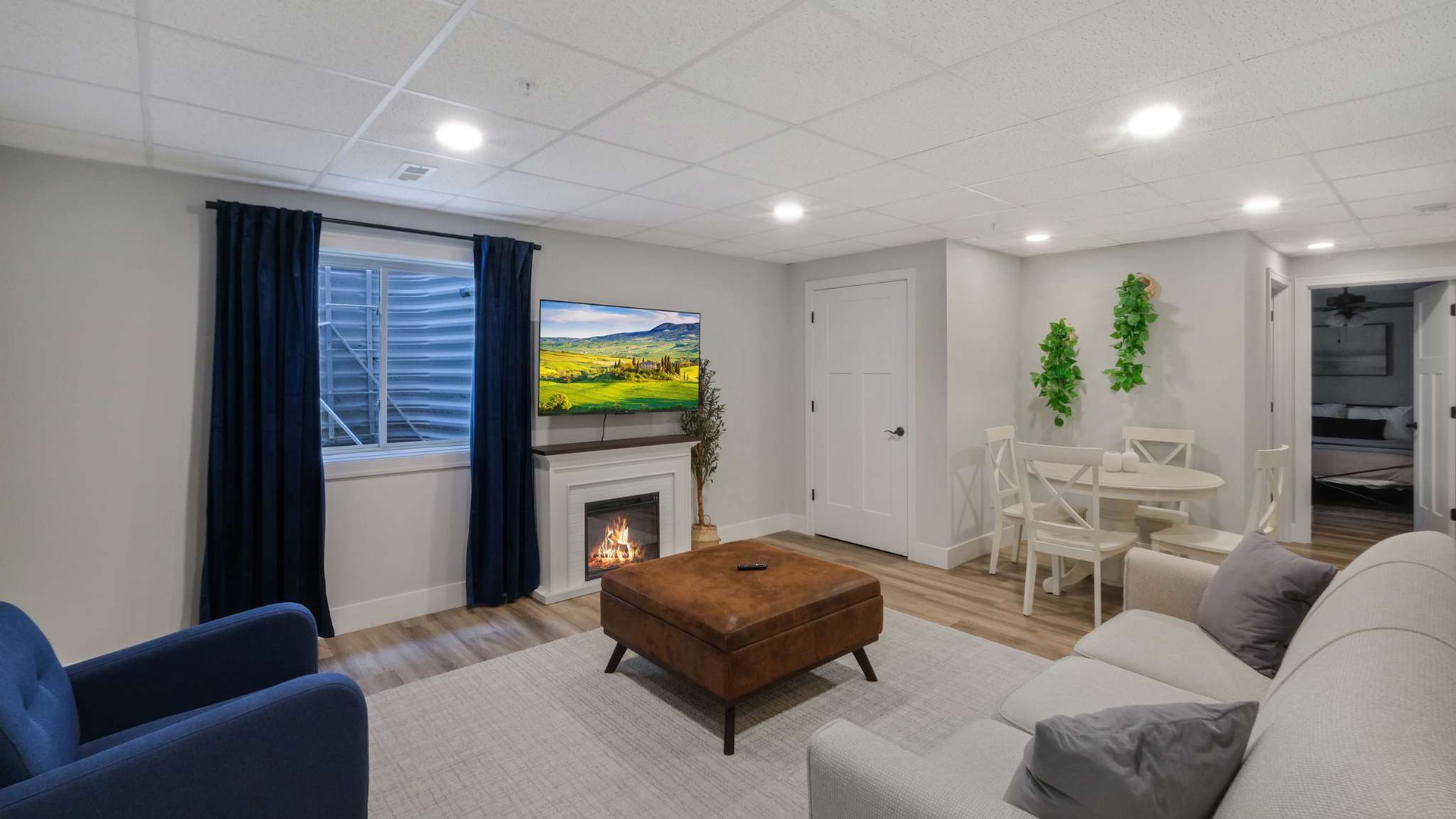Downstairs, you’ll find a second living area ideal for quiet time, games, or streaming your favorite shows. There’s also a second bedroom with a queen-sized bed and another full bathroom, giving guests their own private retreat.