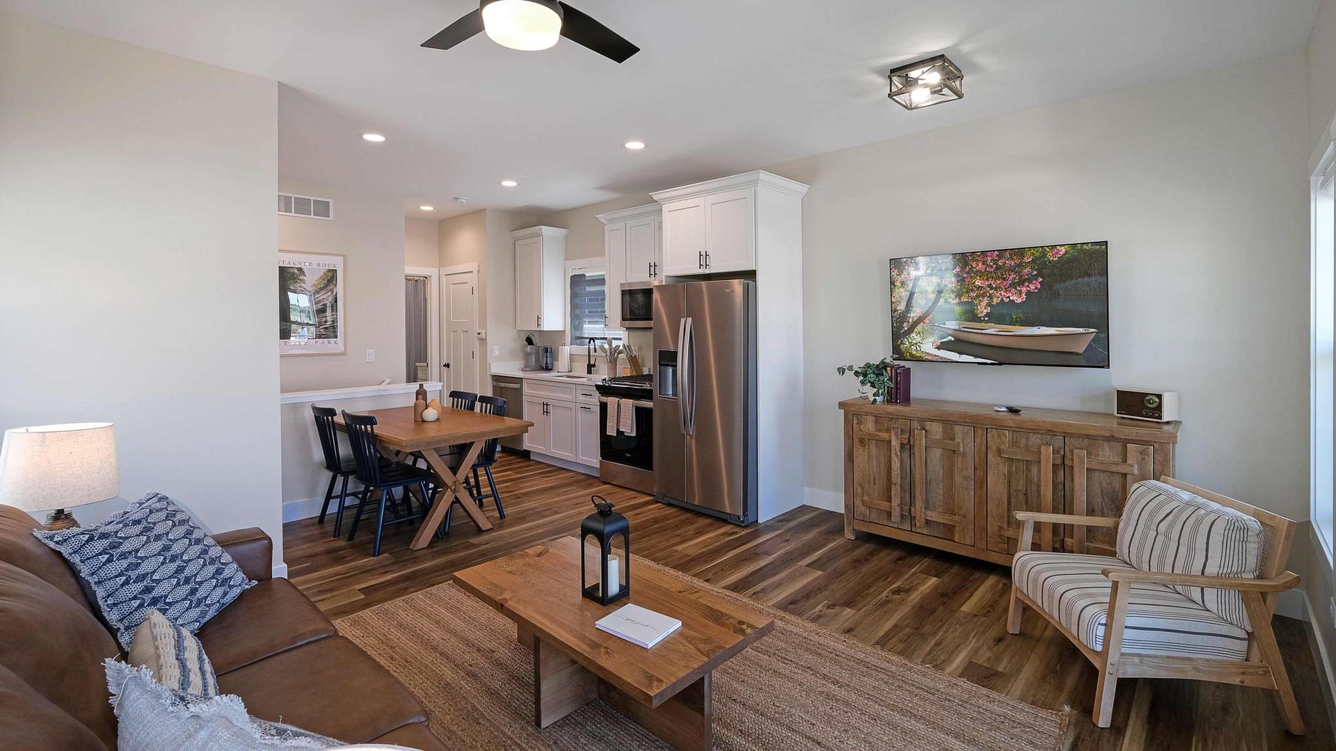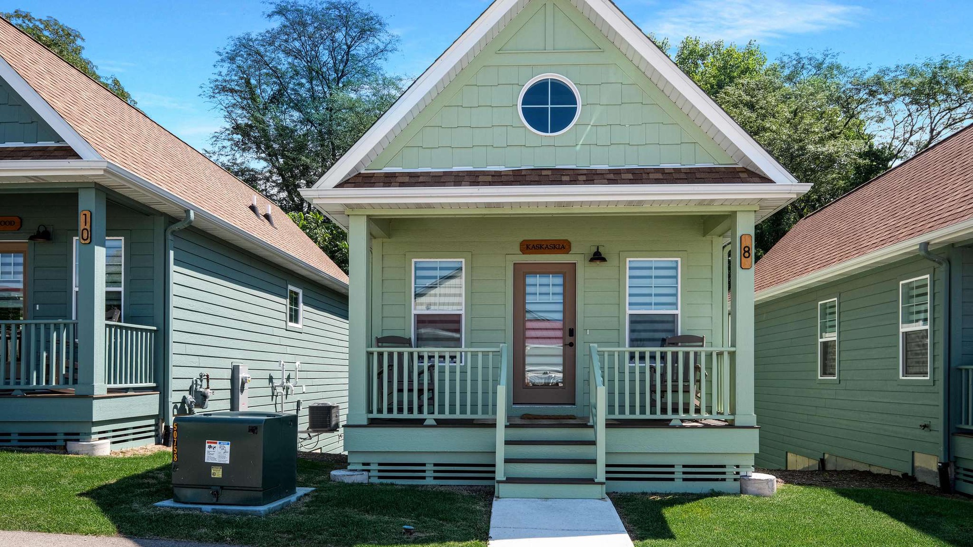 Tucked into the vibrant Navvy Town neighborhood, Kaskaskia is a welcoming two-bedroom cottage designed for relaxation and connection. From the moment you settle into a rocking chair on the front porch to evenings spent on the balcony or exploring the marina, this home invites you to slow down and enjoy harbor life.