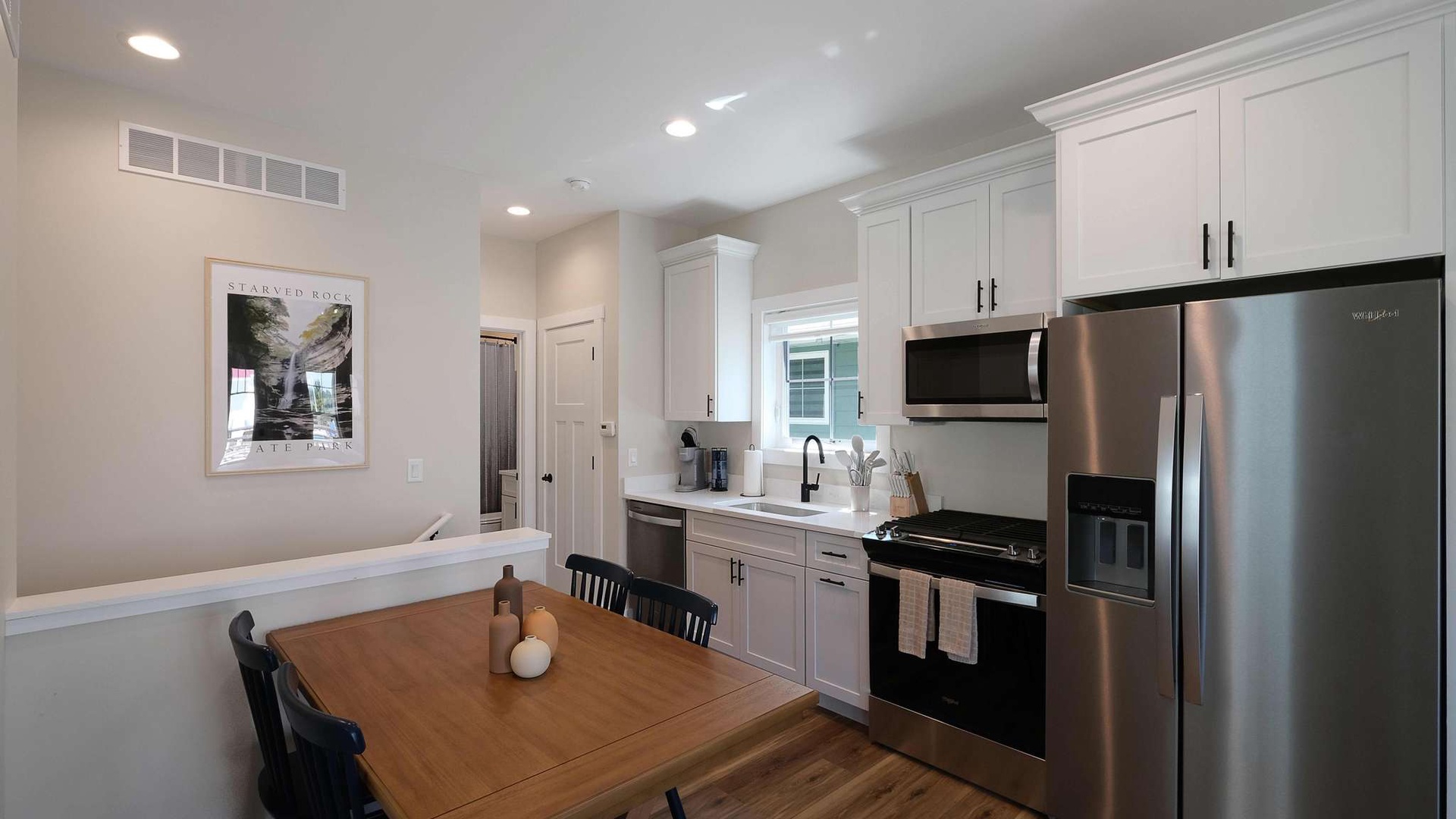 The main floor boasts an open-concept kitchen, dining area, and living room—ideal for cozy meals, card games, or catching up on your favorite shows. The kitchen includes a pantry closet for extended stays, and the dining table is perfect for group meals or morning coffee.