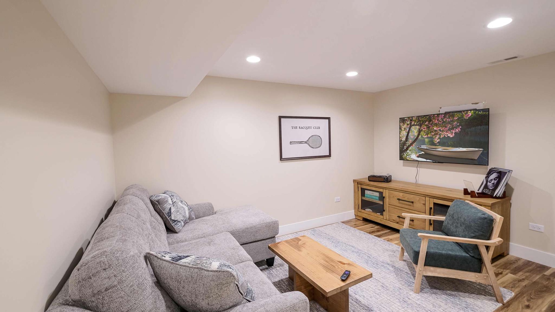 A second family room, with a sofa chaise, perfect for movie nights or quiet reading.