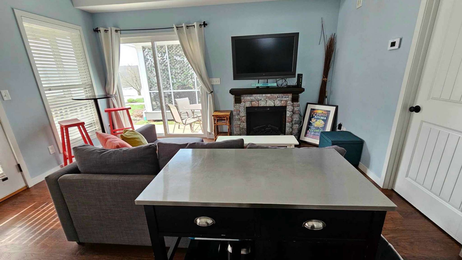 Living Area: Vaulted ceilings, an electric fireplace, smart TV, and large windows that fill the home with natural light.
