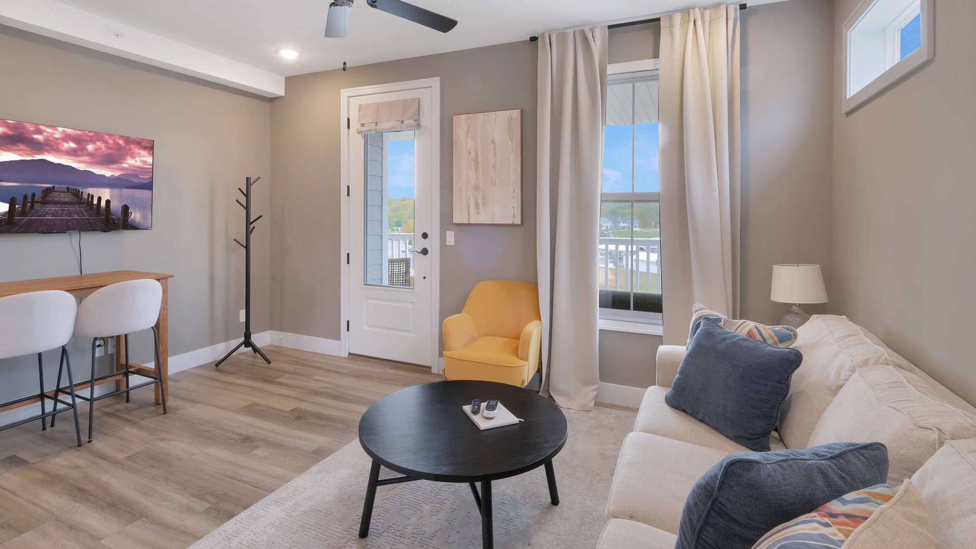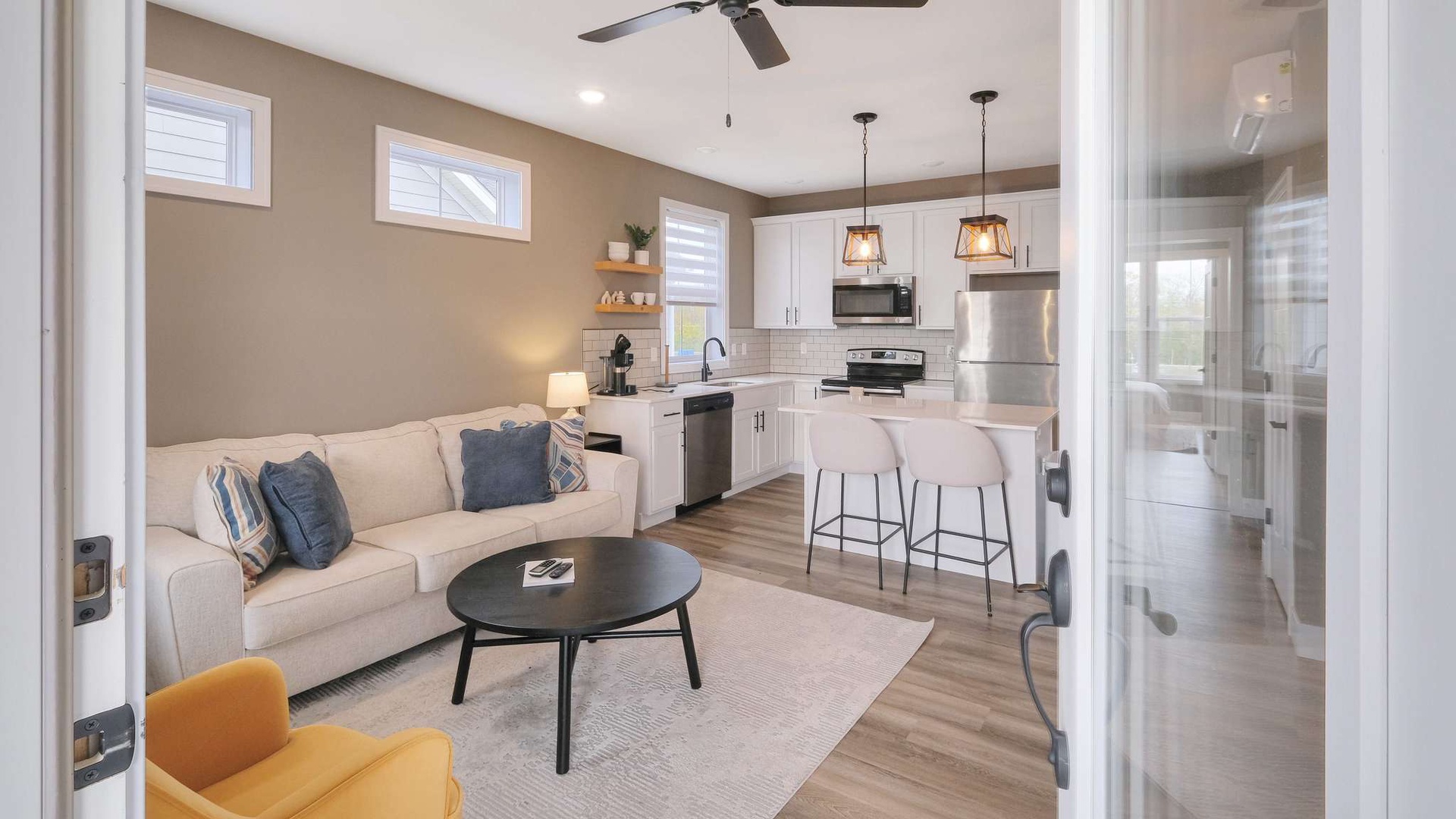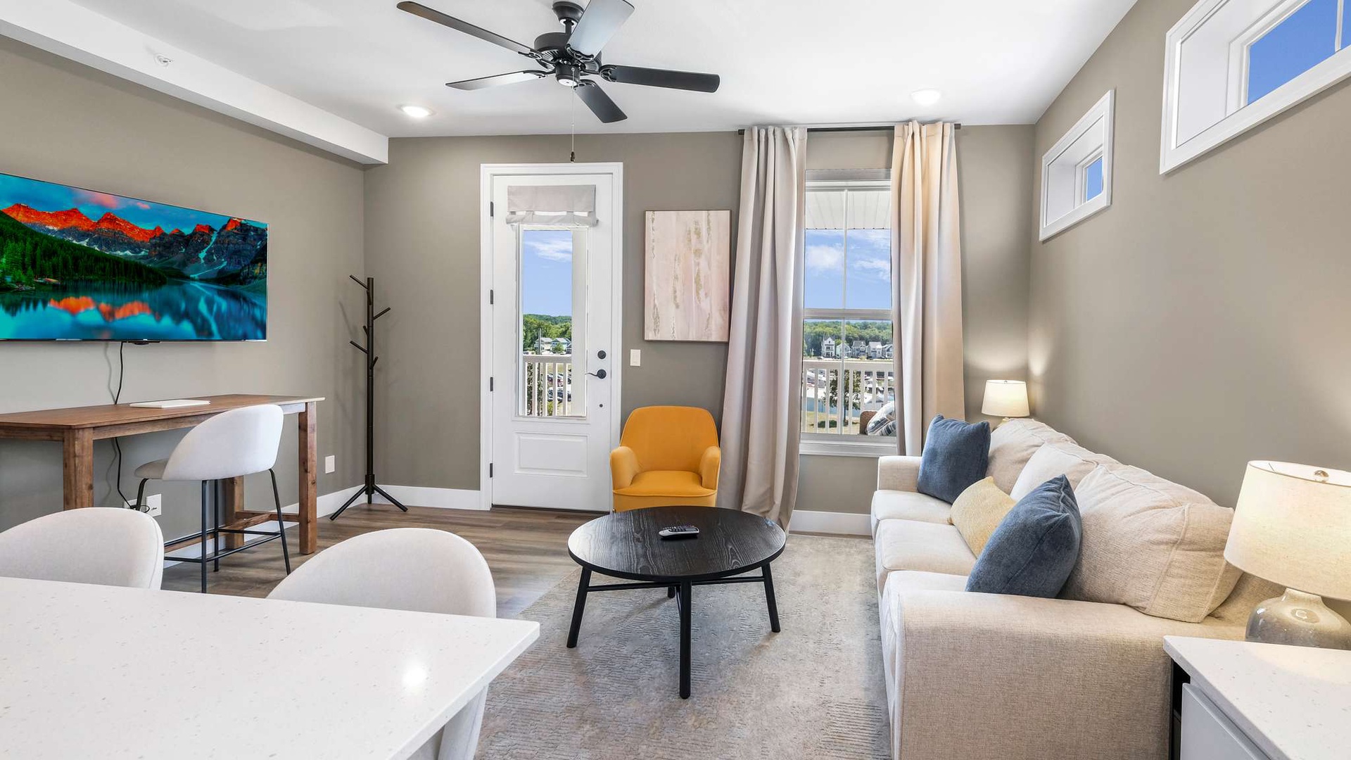 The main living space includes a cheerful living area, a fully equipped kitchen with a spacious island, and access to a private balcony overlooking the marina.