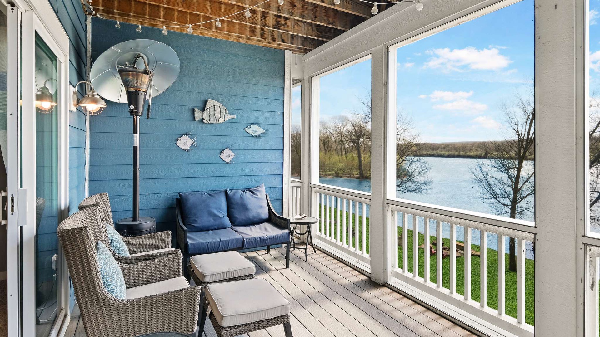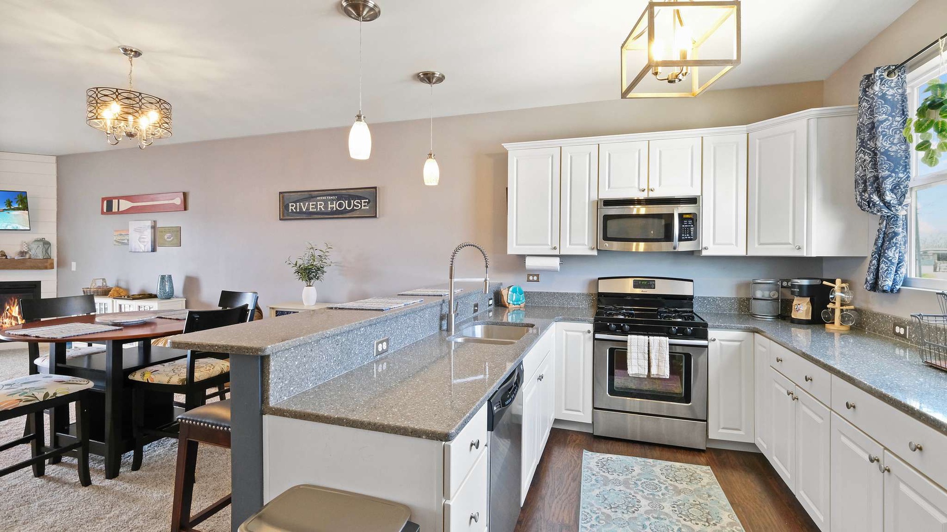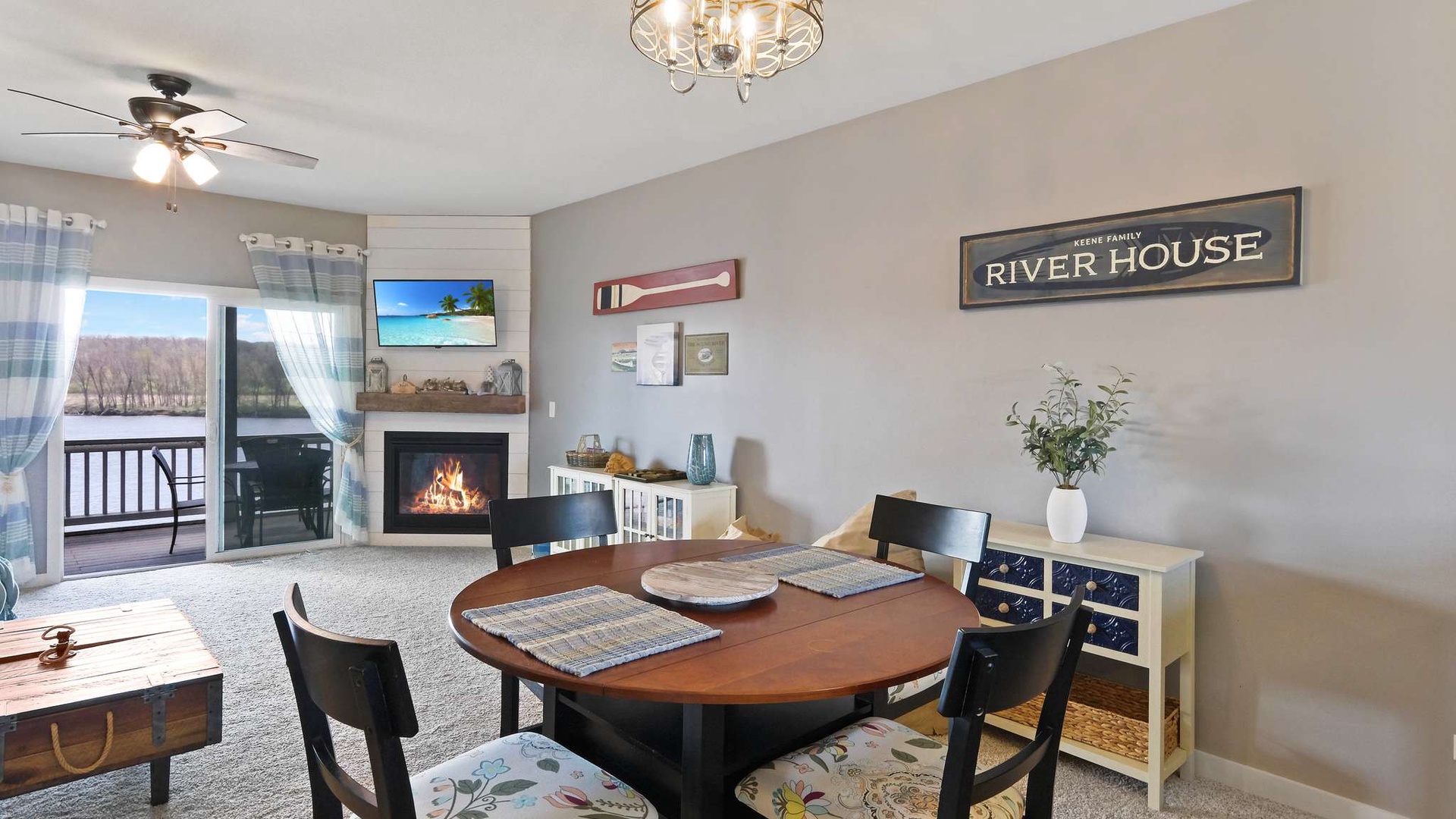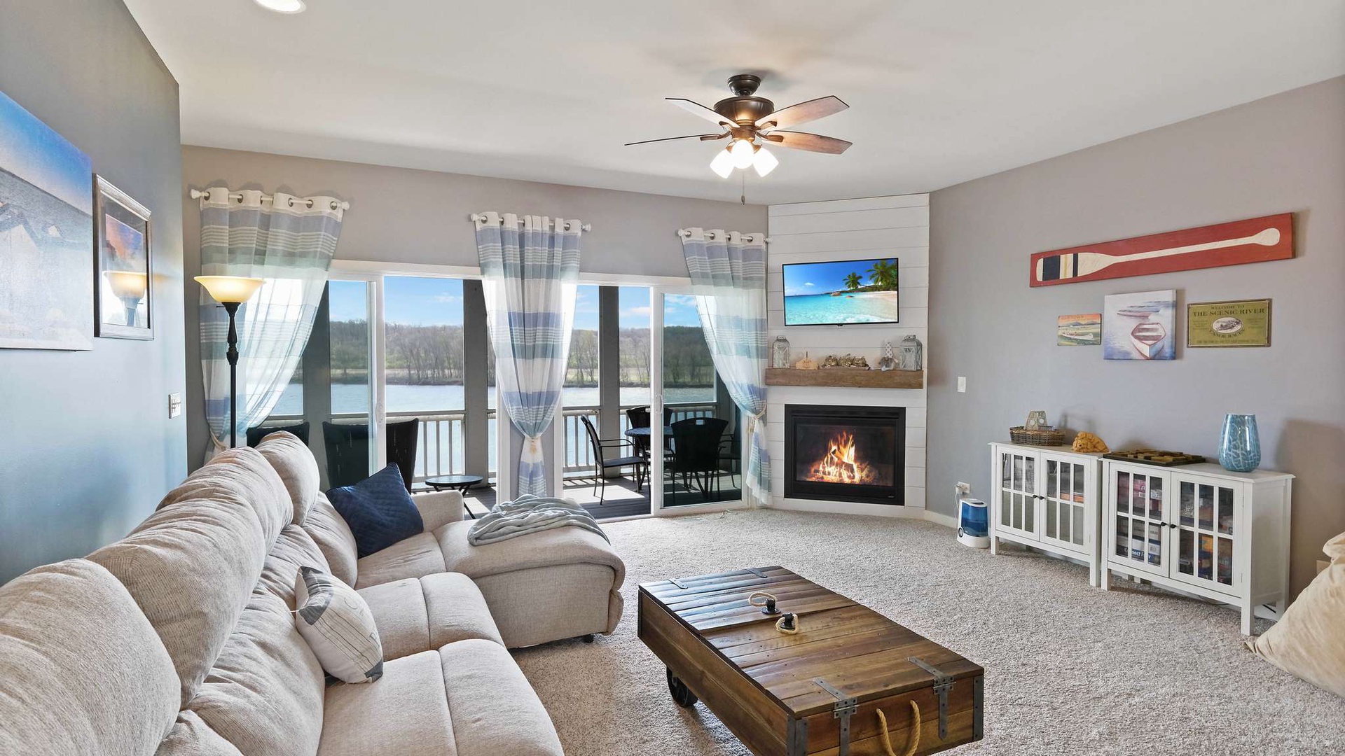 • Main Living Level (Second Floor): Open-concept living, dining, and kitchen area with gas fireplace, flat-screen TV, and private balcony with river views