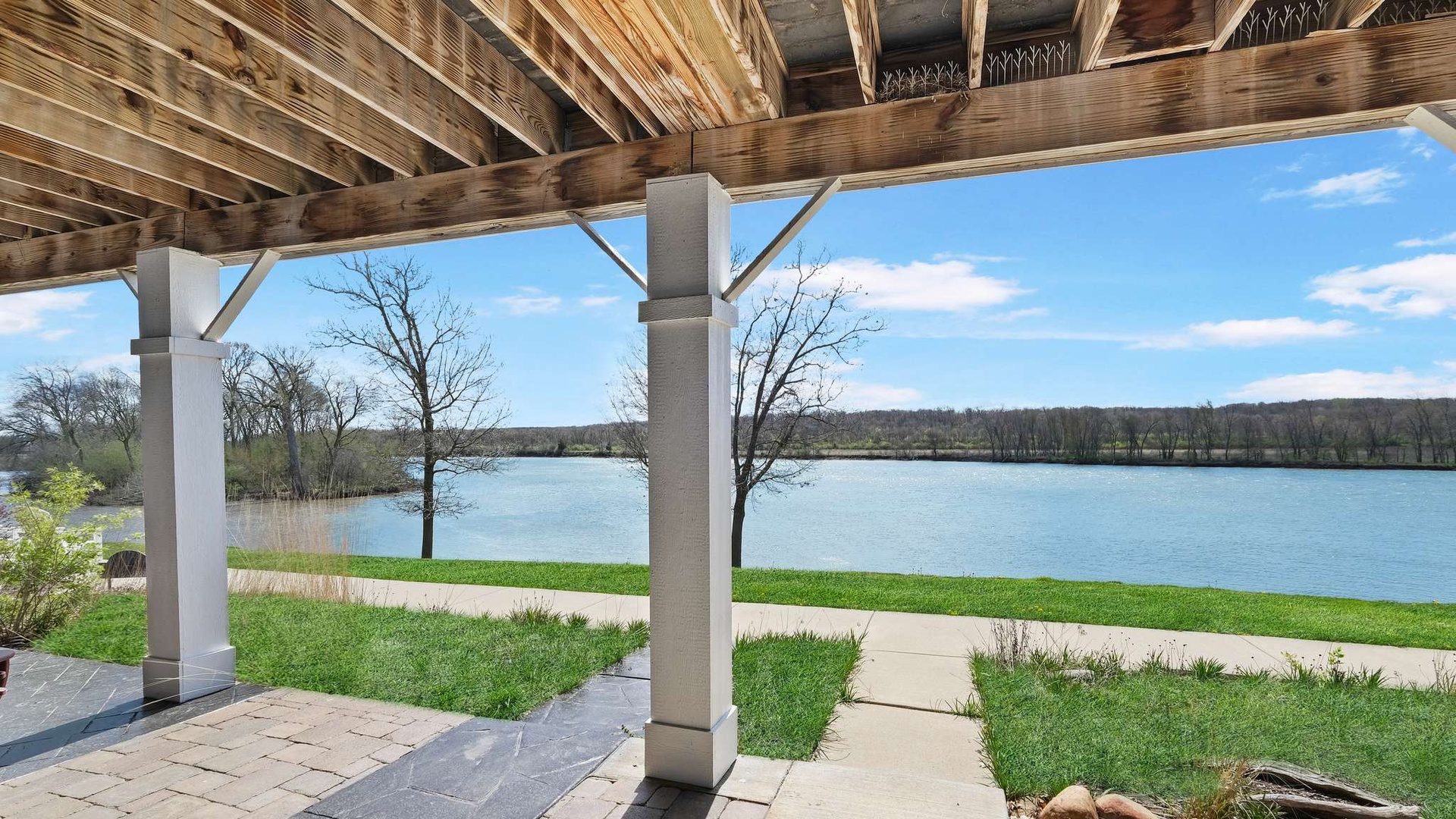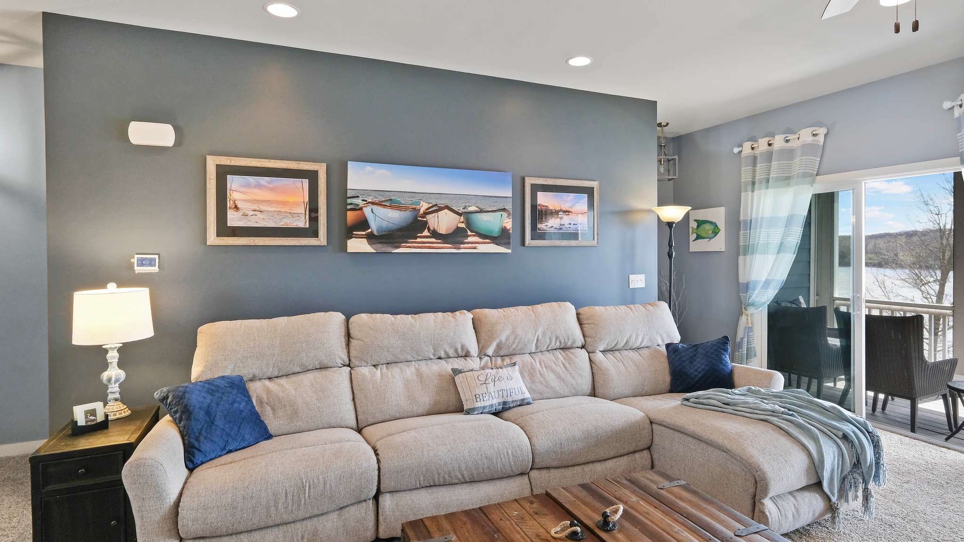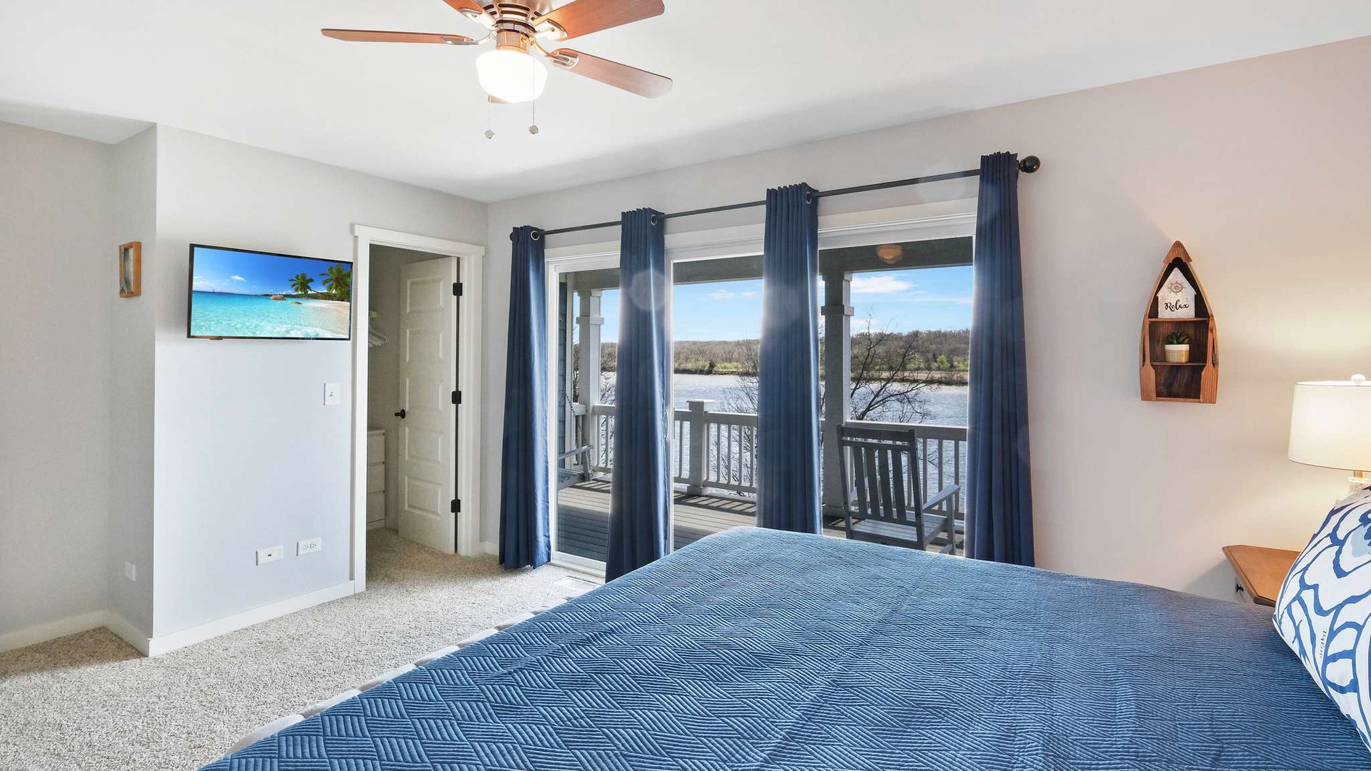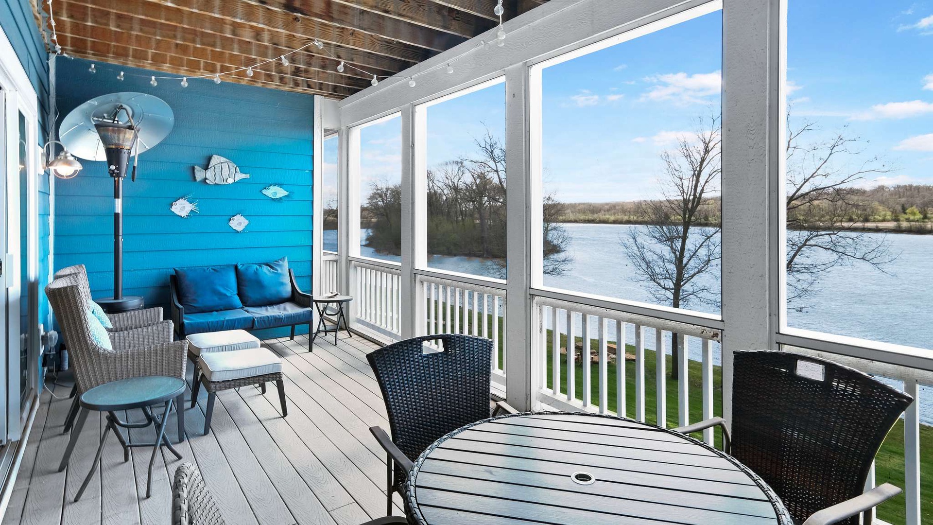 • Main Living Level (Second Floor): Open-concept living, dining, and kitchen area with gas fireplace, flat-screen TV, and private balcony with river views