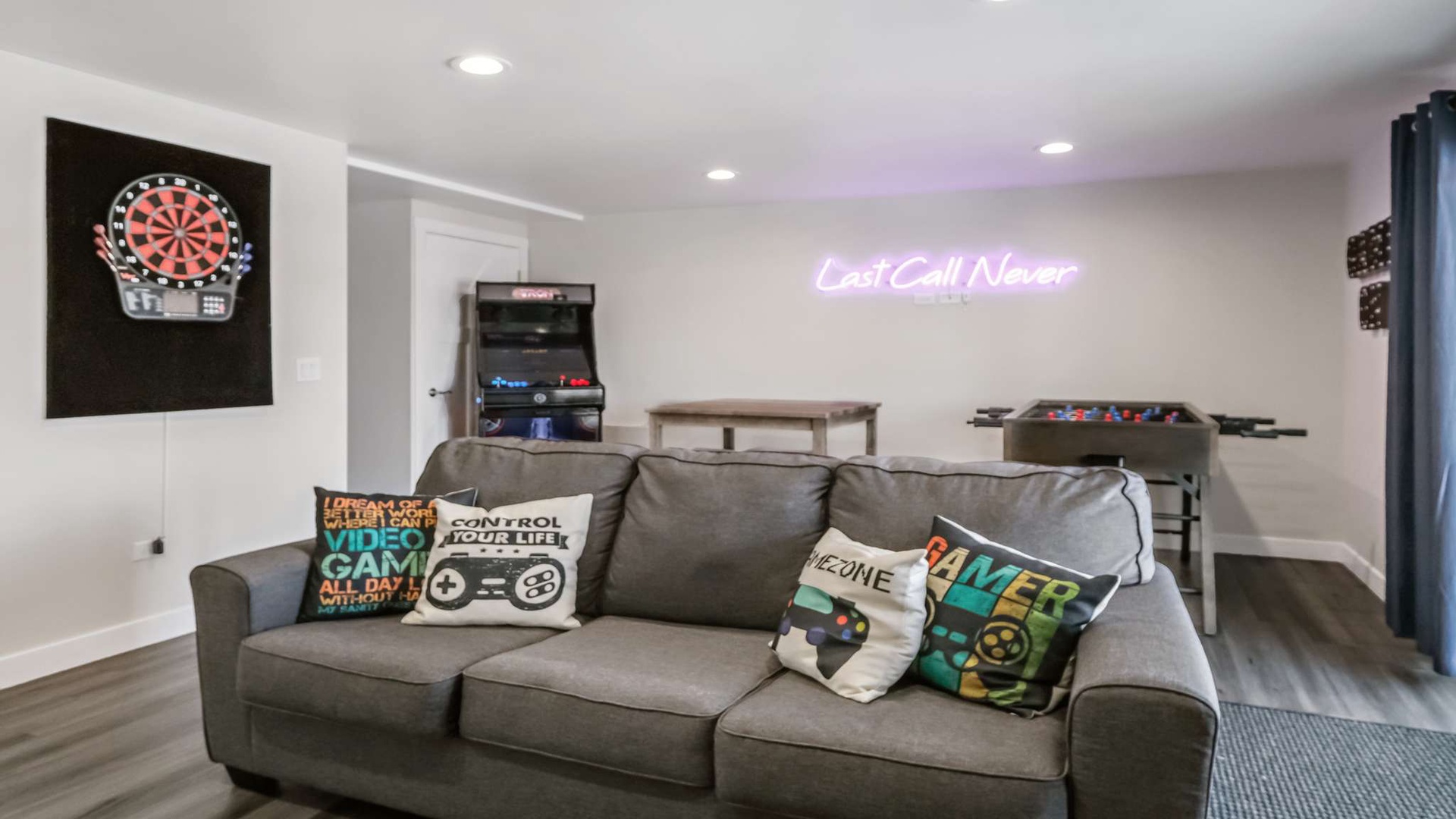 Bonus Room: Spacious game and hangout area featuring a comfy couch, flat-screen TV, foosball table, and board games—a kid (or kid-at-heart) favorite