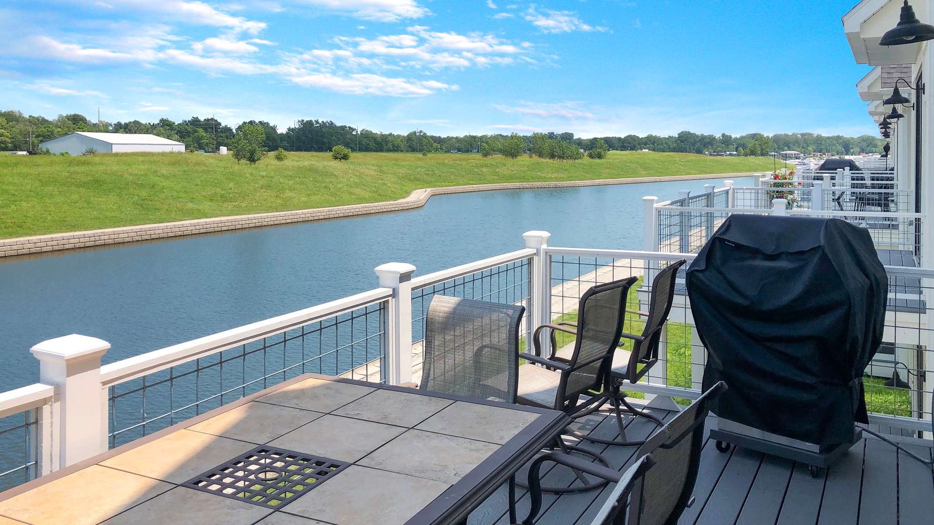 Sliding glass doors lead out to a covered walkout patio with harbor views and space to relax in the fresh air.