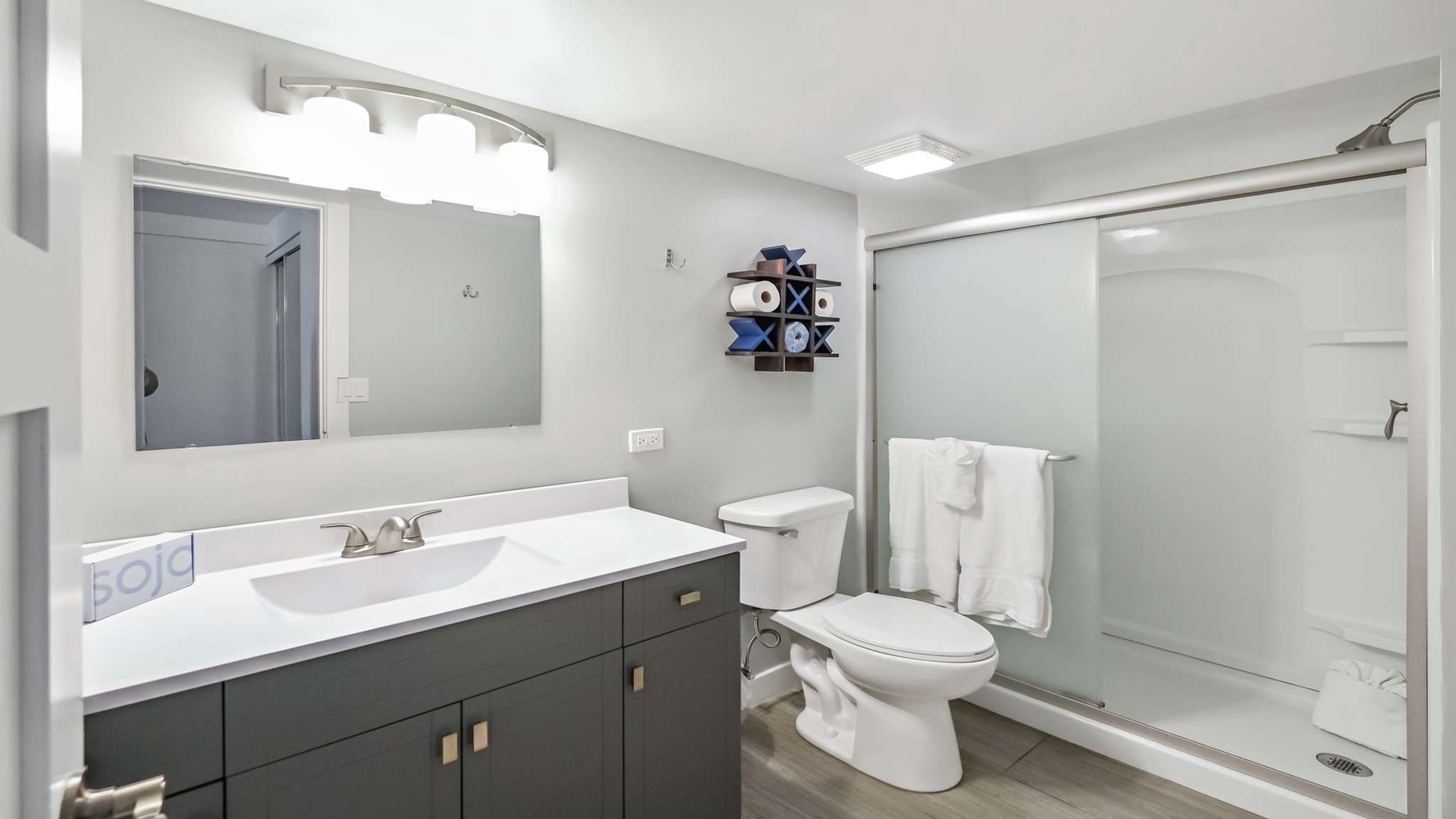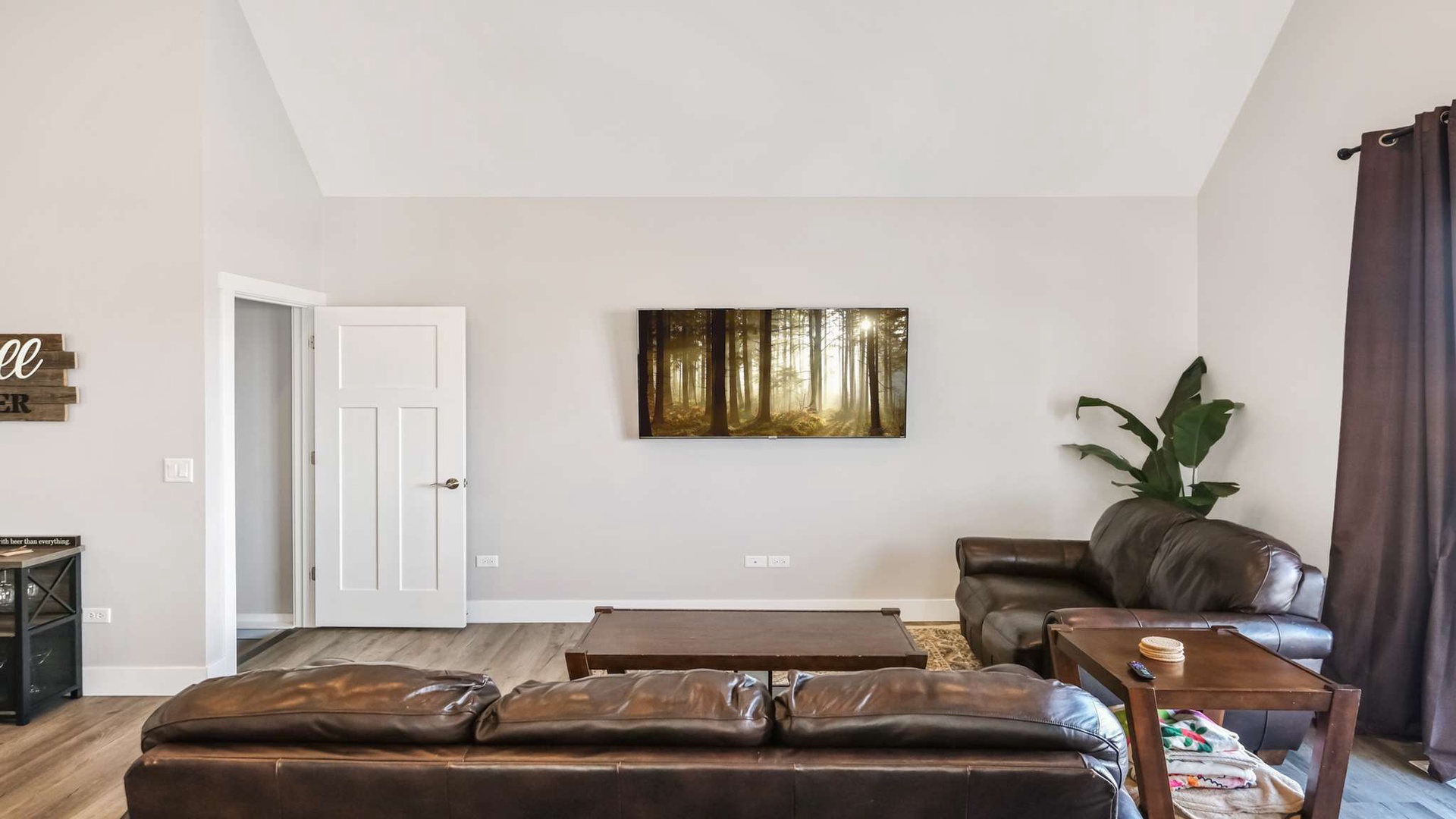The primary bedroom is also on this level, offering a king-size bed and flat-screen TV for your private escape. A half bath is conveniently located off the main living area.