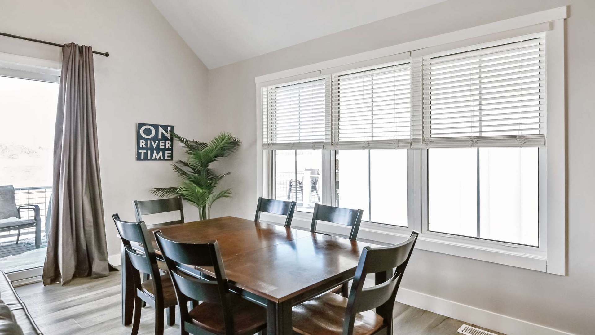 Step into a bright, open-concept main floor with a gourmet kitchen that includes granite countertops, stainless-steel appliances, a microwave, and island seating for three. The dining table offers additional seating for six, making it easy to gather for meals or game night.