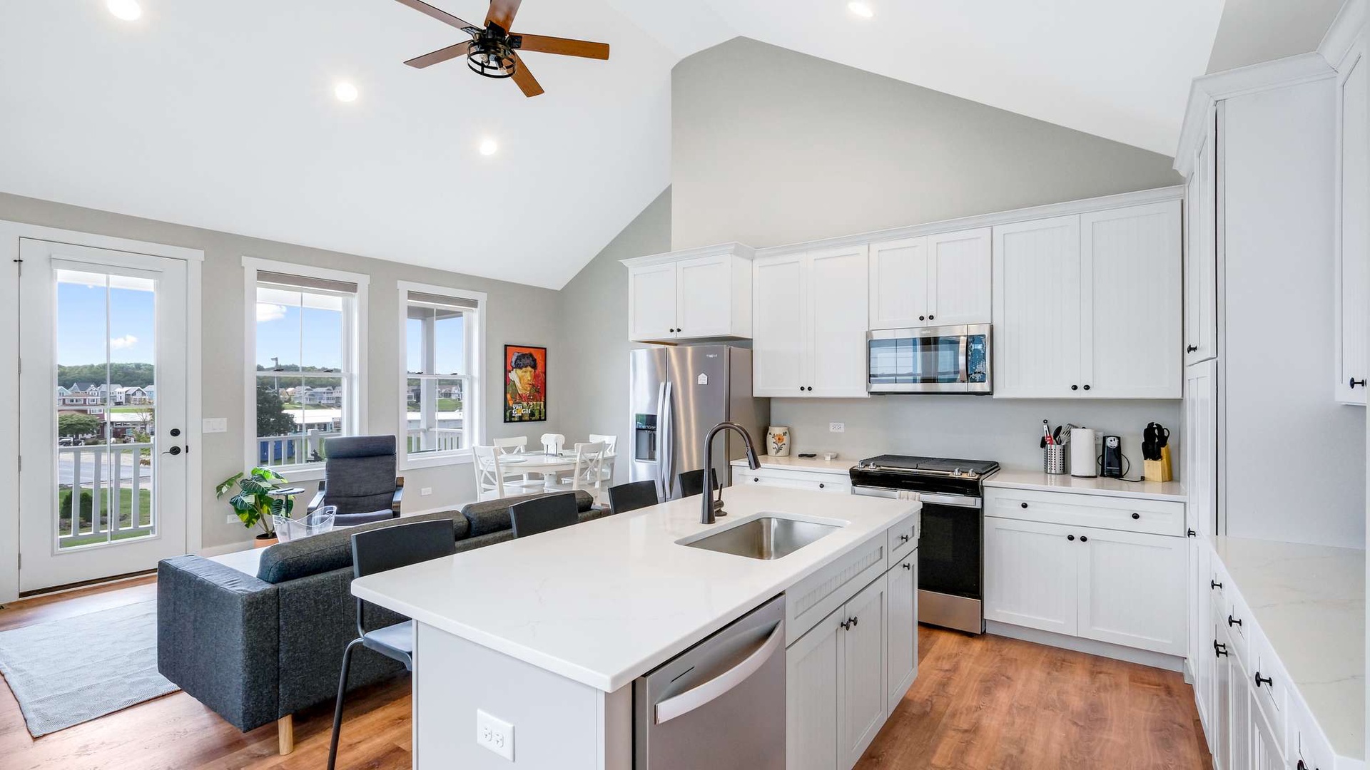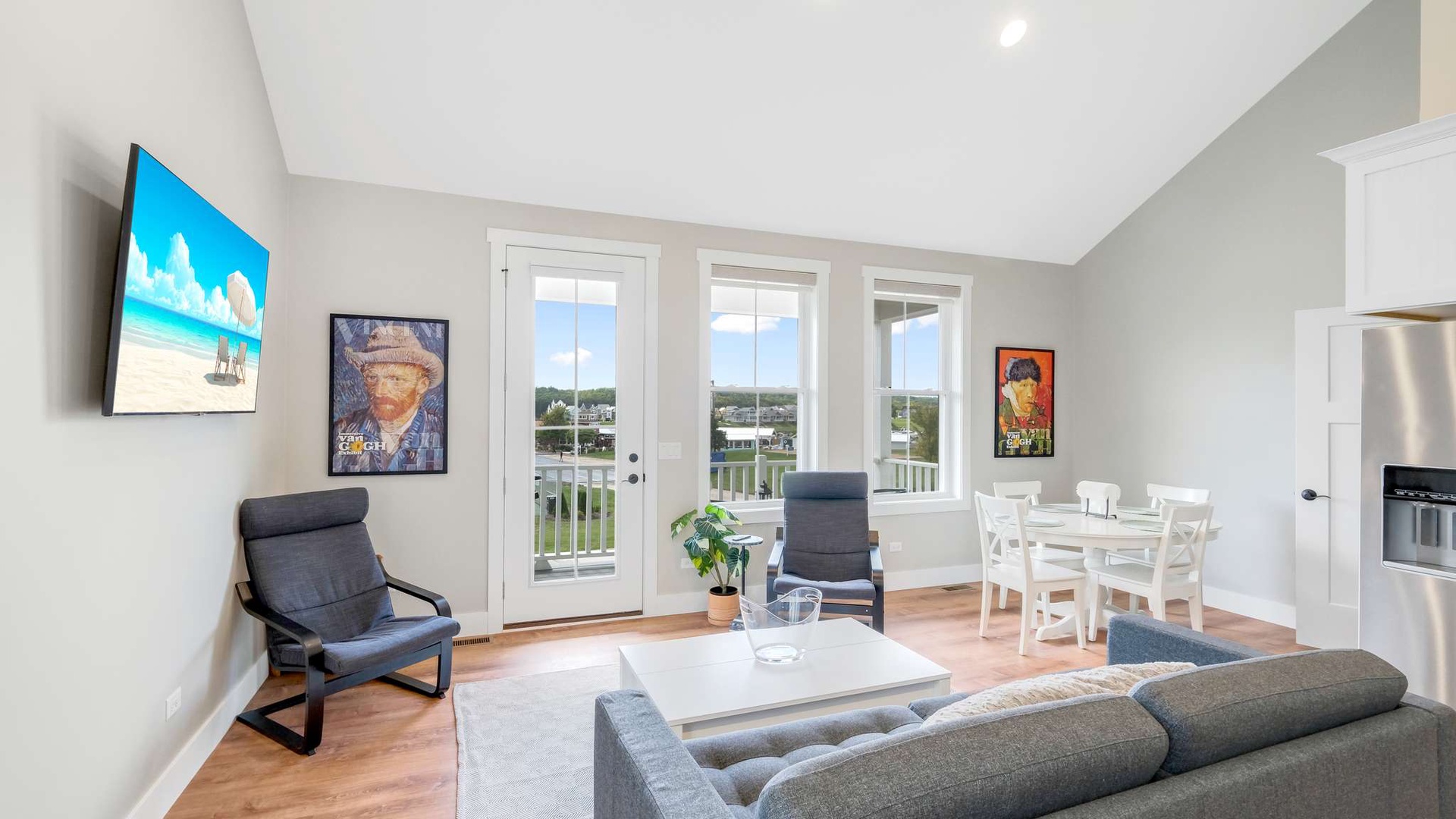 The main level features an open-concept kitchen, dining, and living area filled with natural light and comfortable furnishings. The fully equipped kitchen has everything you need to prepare and serve meals at home, while the spacious living room opens onto a private balcony overlooking the marina—ideal for coffee at sunrise or wine at sunset.