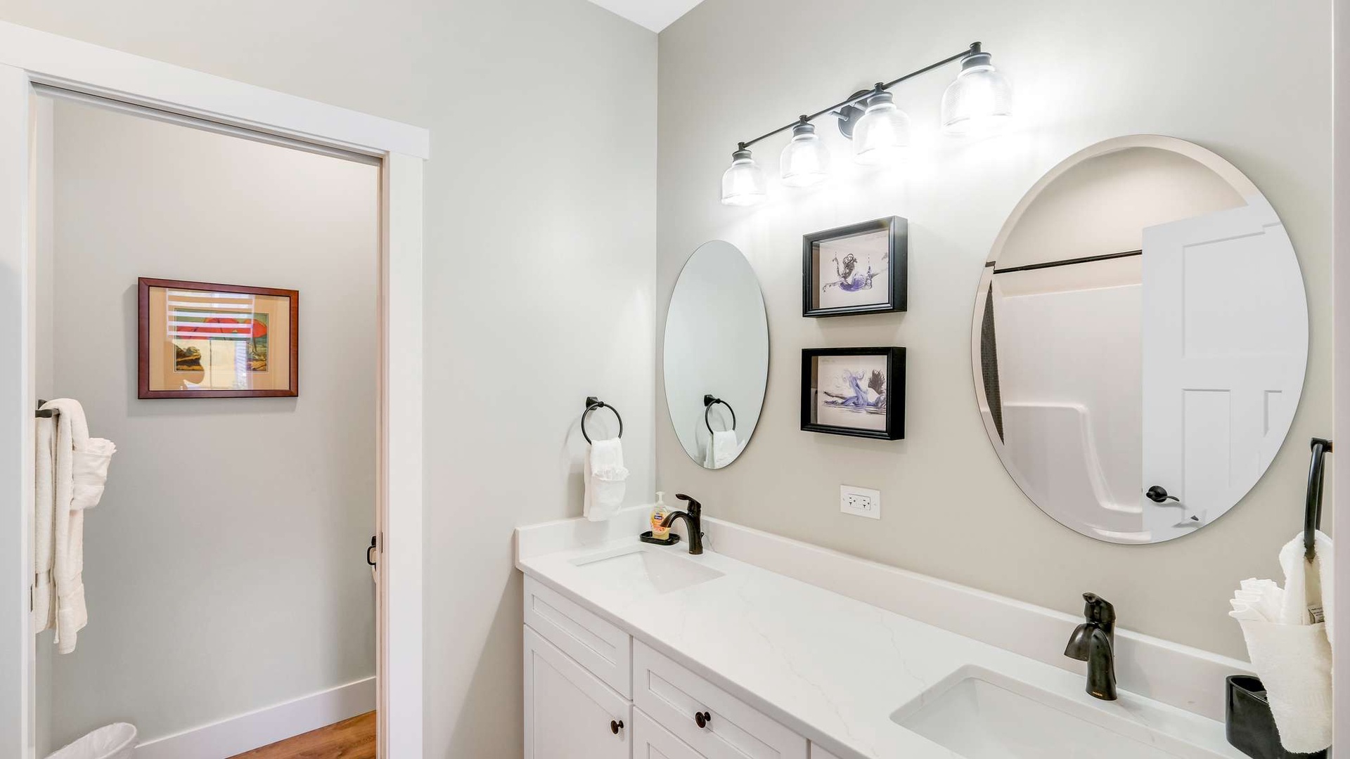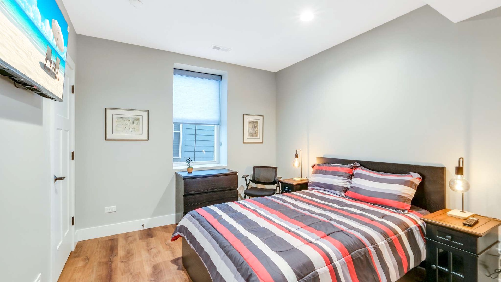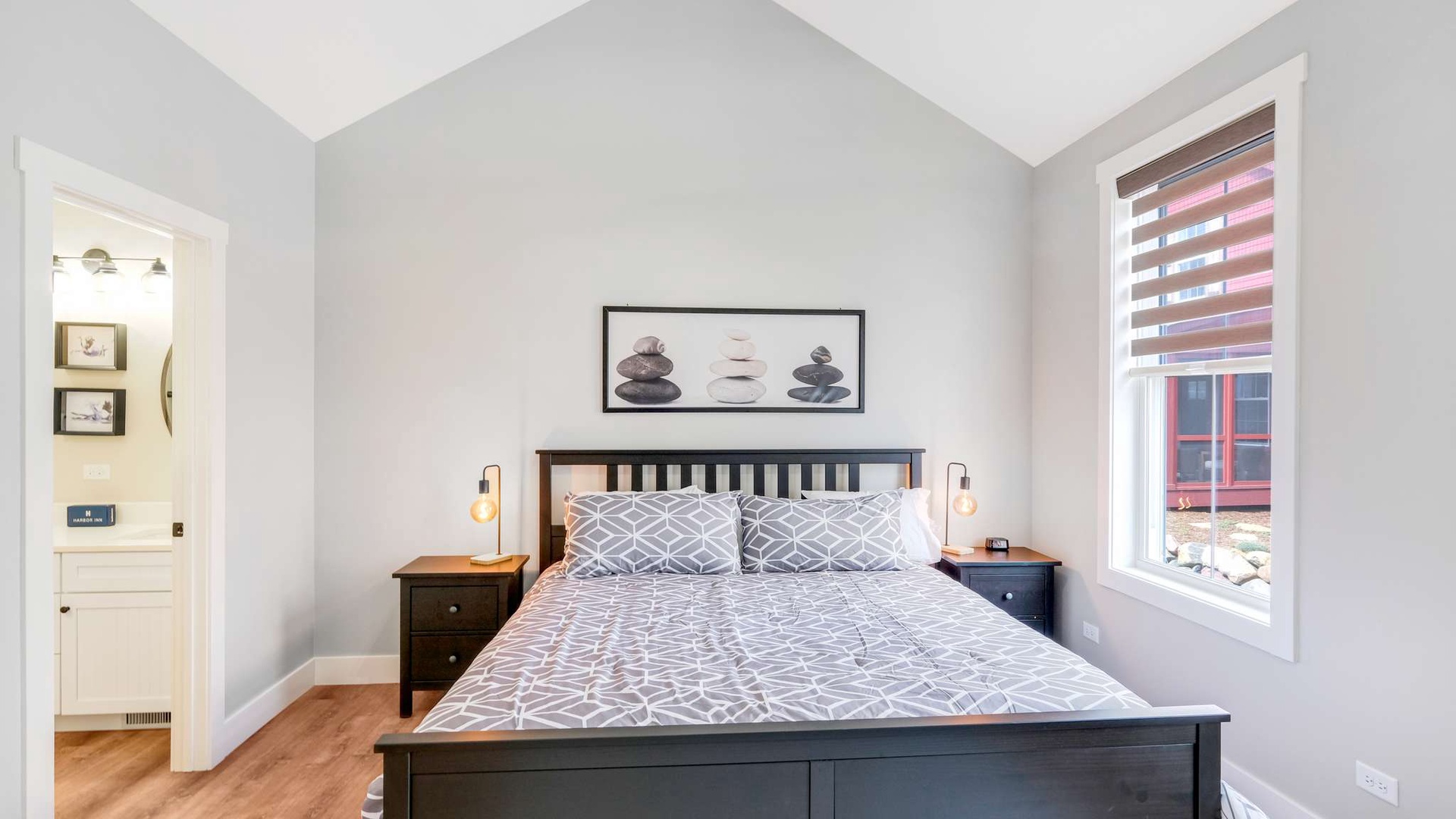 Downstairs, two beautifully furnished bedrooms each offer queen beds, while a shared full bathroom provides plenty of space for everyone. A laundry area adds convenience for longer stays.