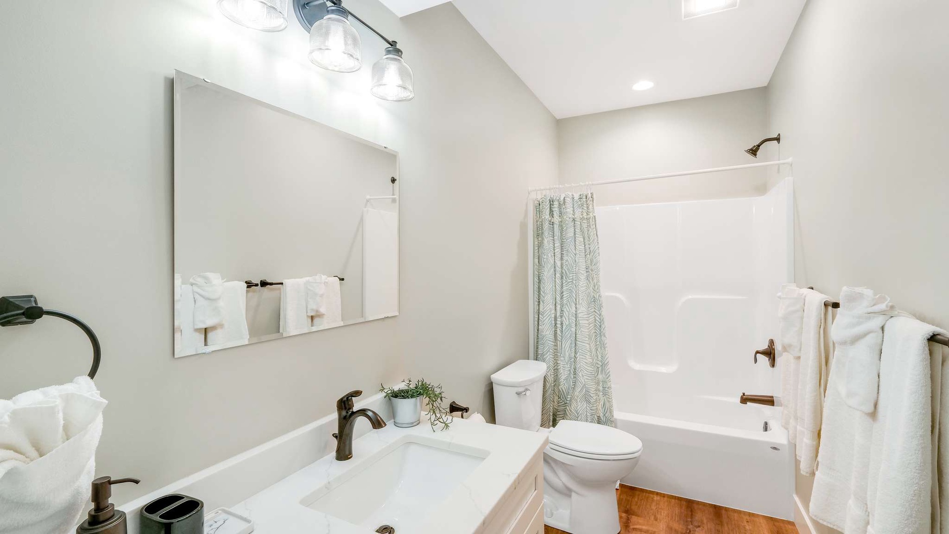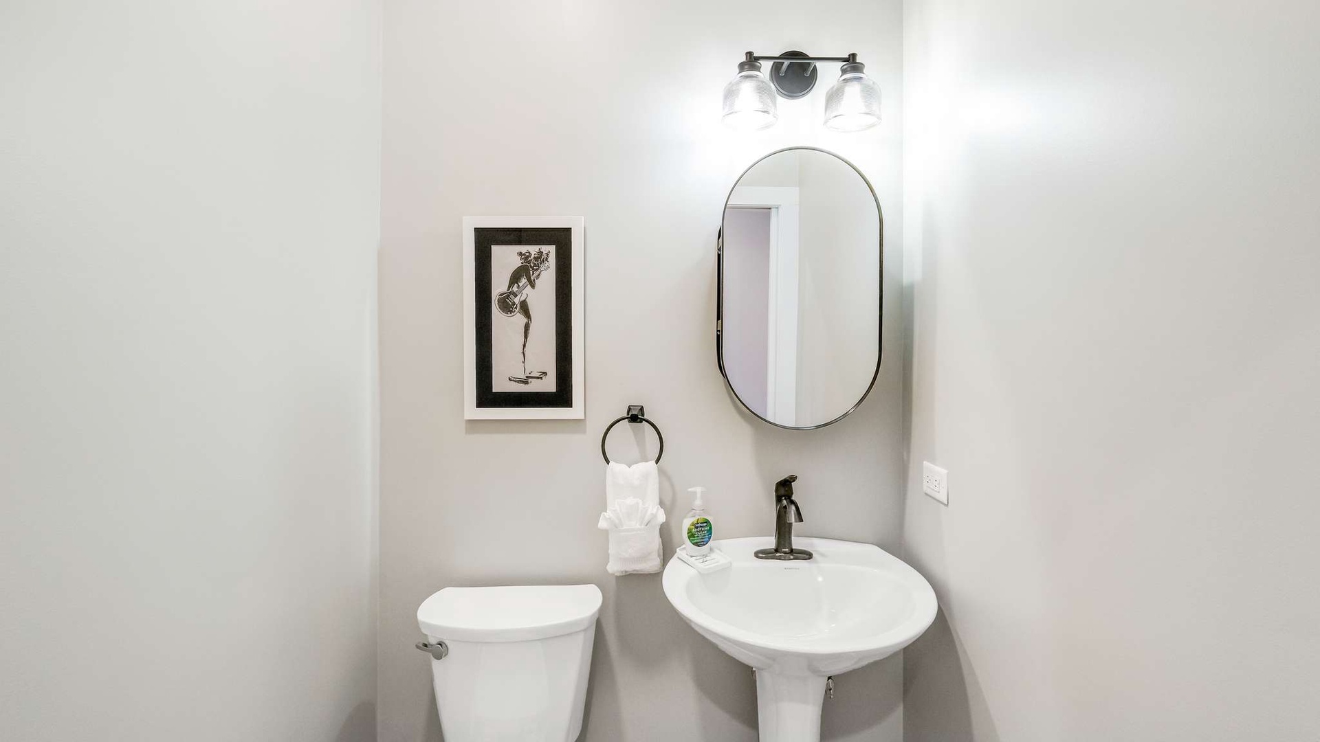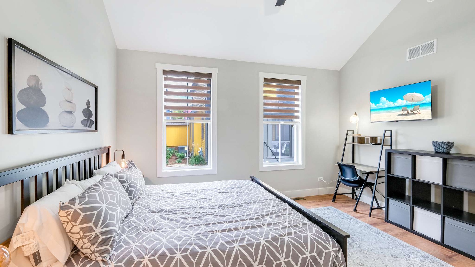 Downstairs, two beautifully furnished bedrooms each offer queen beds, while a shared full bathroom provides plenty of space for everyone. A laundry area adds convenience for longer stays.