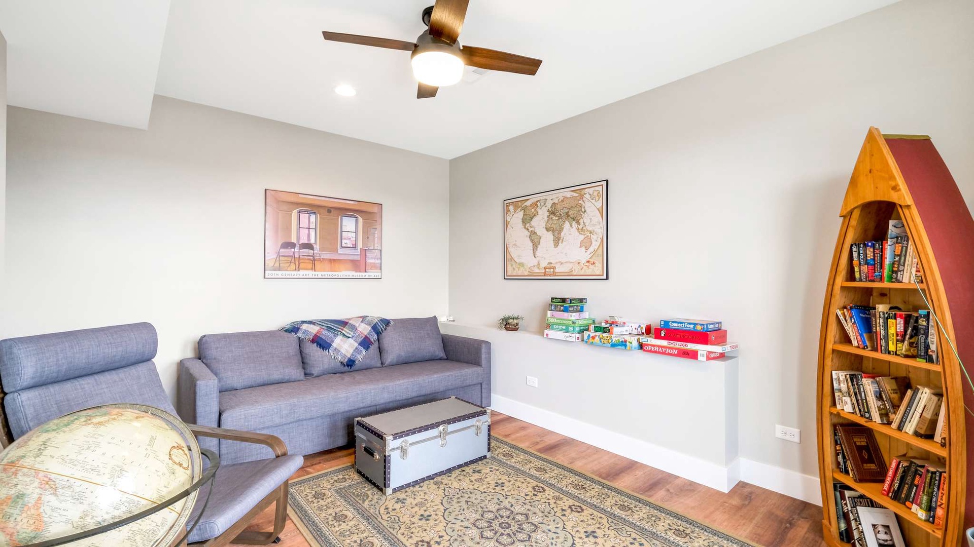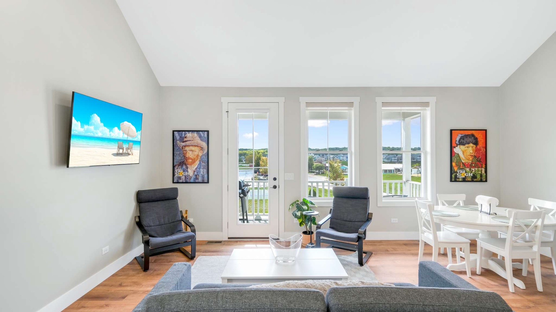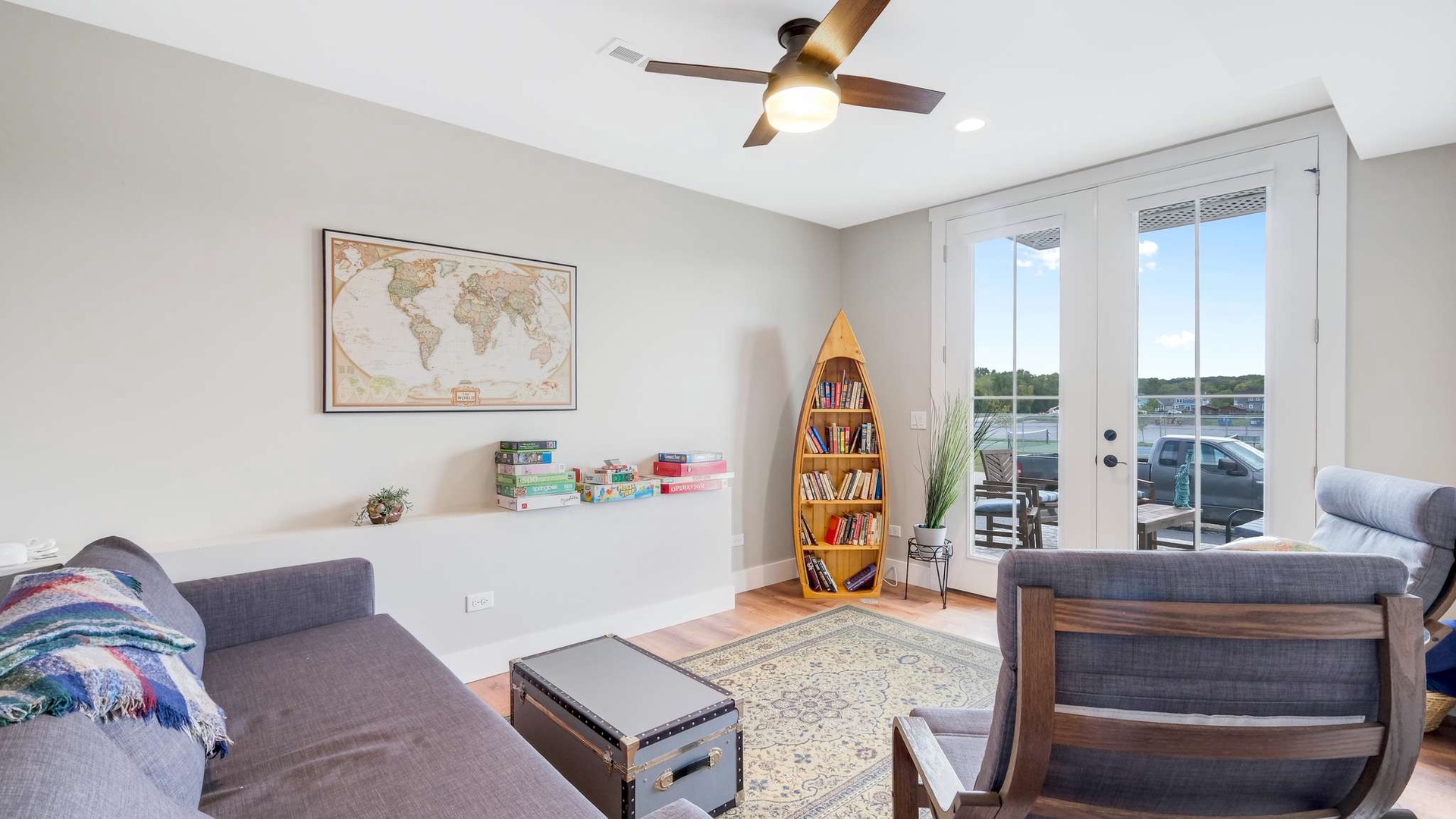 The recreation room is perfect for games, movie nights, or curling up with a good book. A pull-out sofa provides additional sleeping space, and glass doors lead to a walkout patio with peaceful views of the harbor.