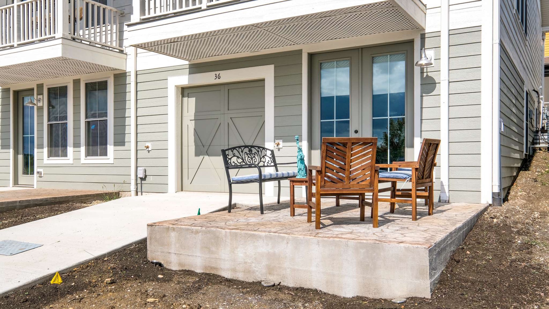 Colorful row of modern townhomes with spacious central lawn and gravel pathways in a charming residential development.