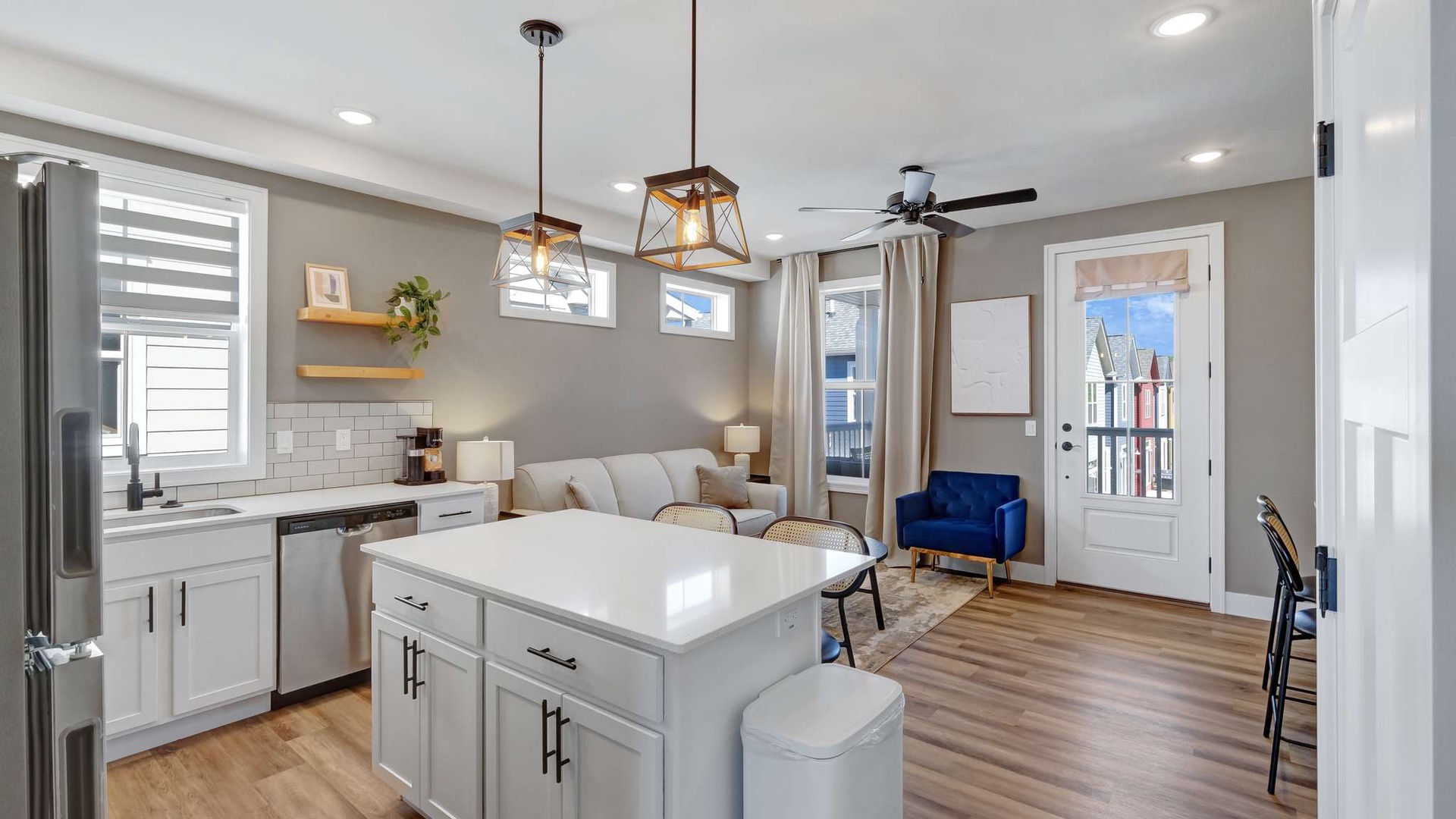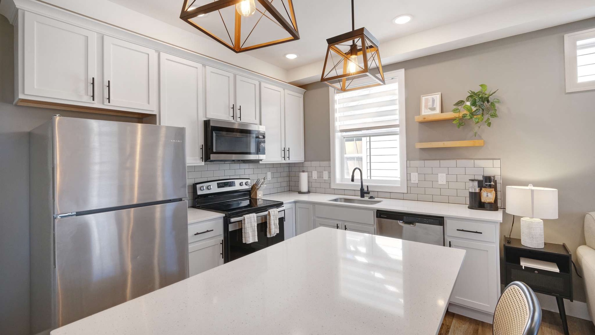 The main level features a fully stocked kitchen with modern appliances, cookware, and coffee maker, along with an open living area and pull-out sofa for extra sleeping space. Full bathroom conveniently located nearby. Stackable washer/dryer included for added convenience.