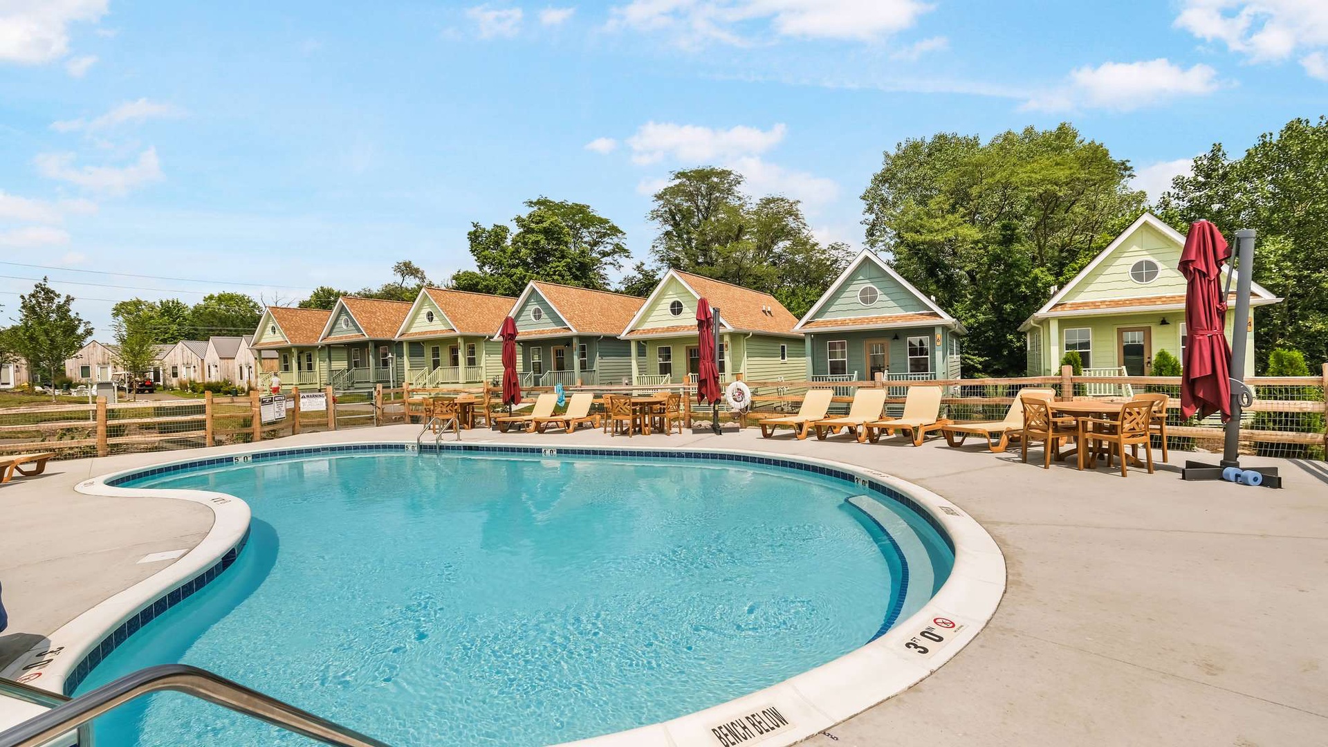 Charming cottage-style vacation homes surrounding a pristine swimming pool with comfortable outdoor seating and umbrellas for relaxation.