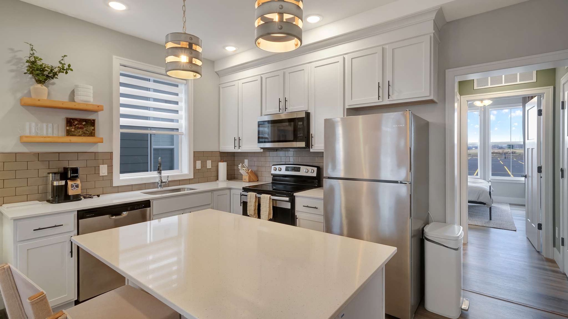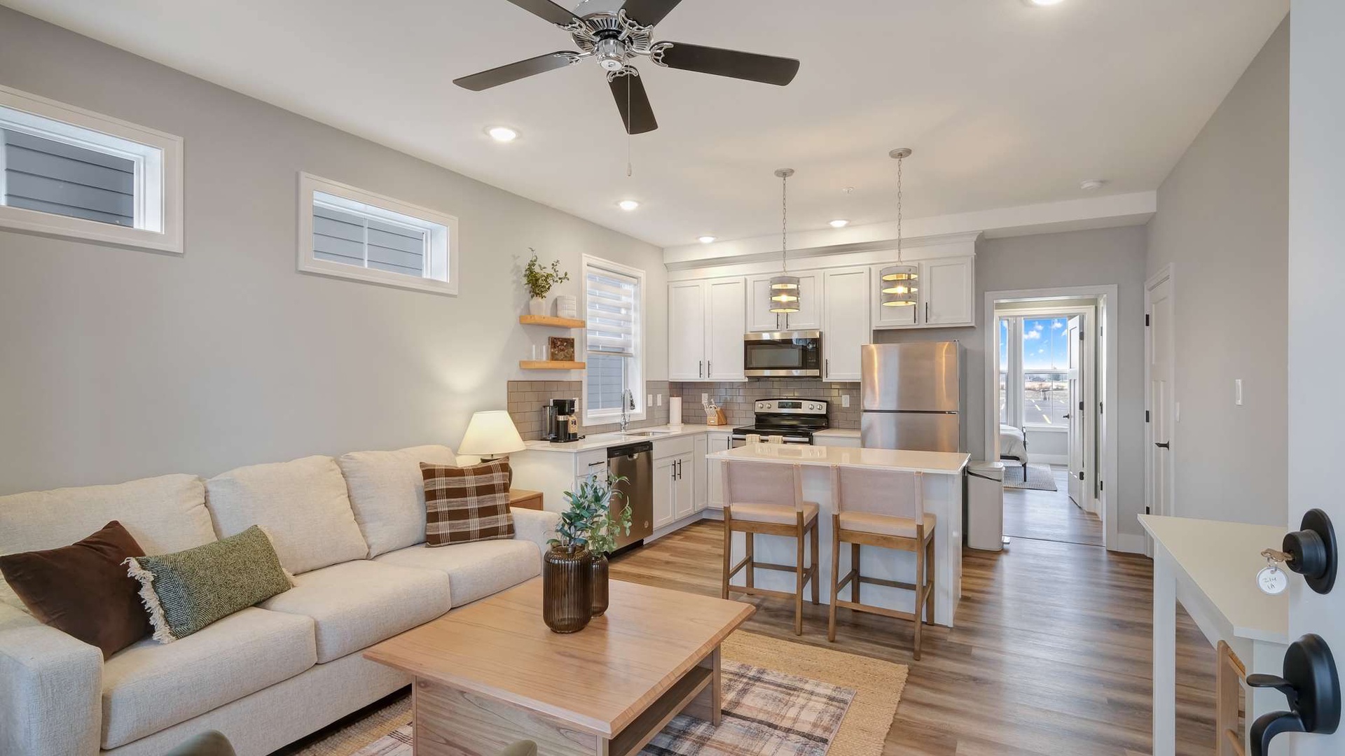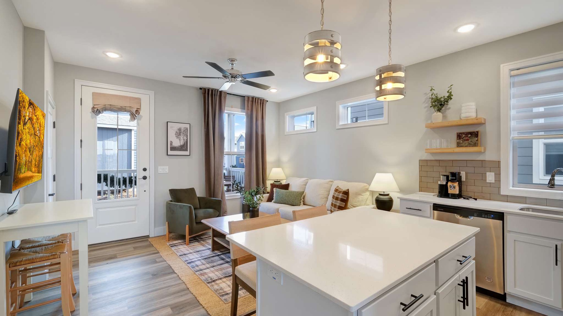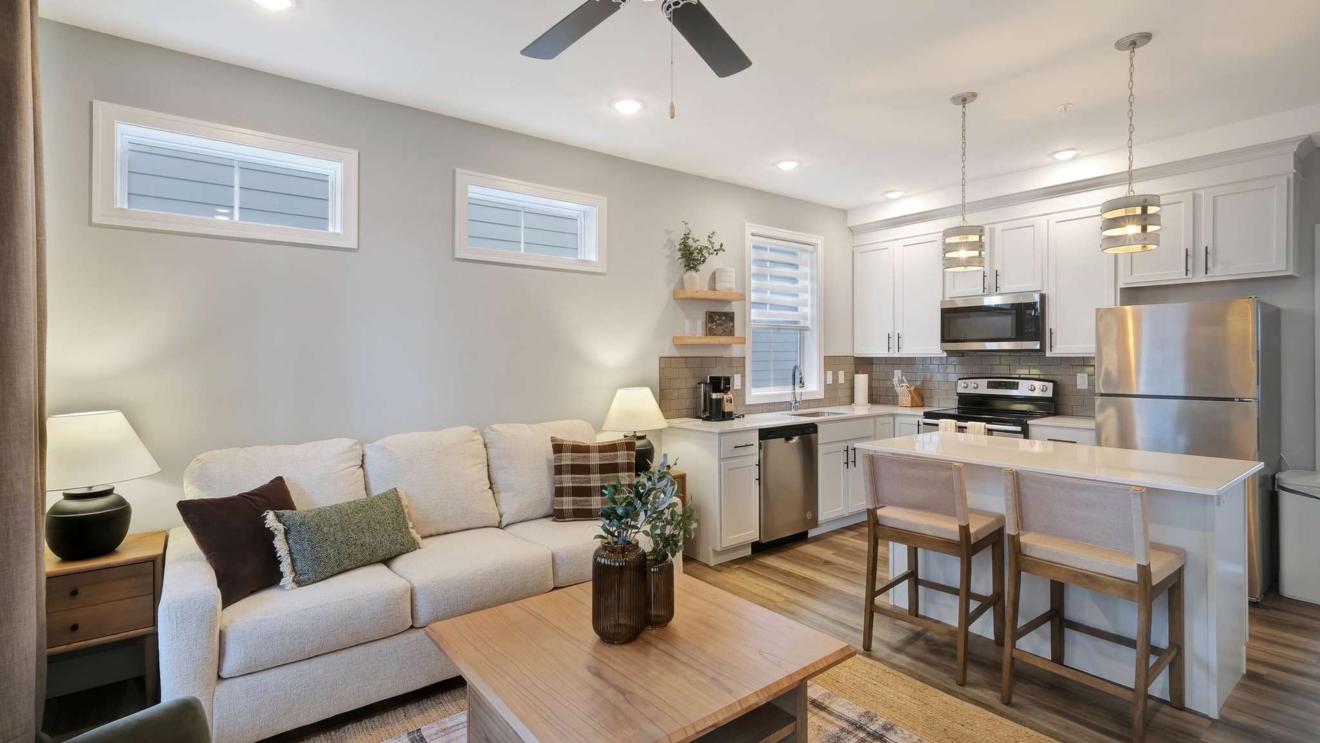 The main level features a fully stocked kitchen with modern appliances, cookware, and coffee maker, along with an open living area with a pull-out sofa for extra sleeping space. Full bathroom conveniently located nearby. Stackable washer/dryer included for added convenience.