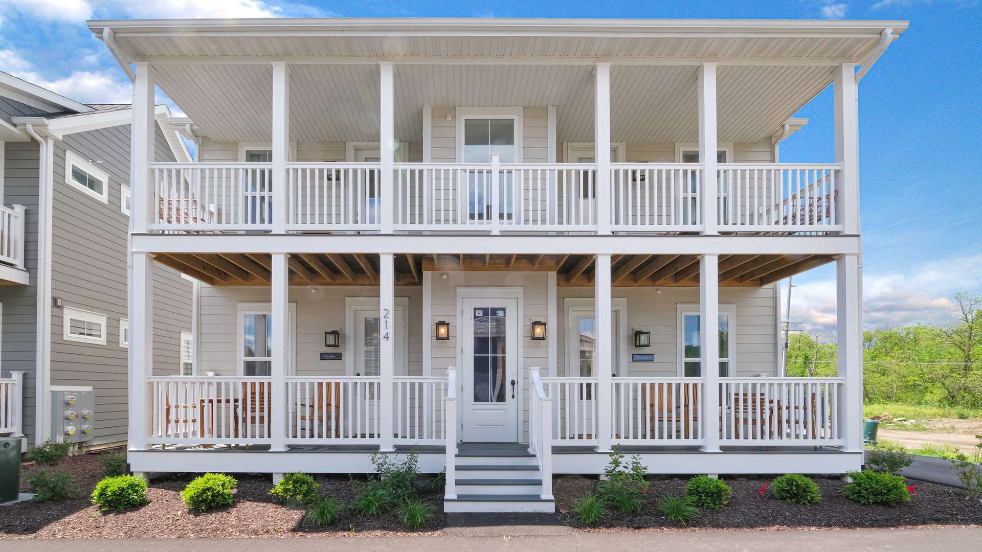 Navvy Town vacation rental offers multiple balconies and spacious accommodations in a peaceful setting with beautiful landscaping.