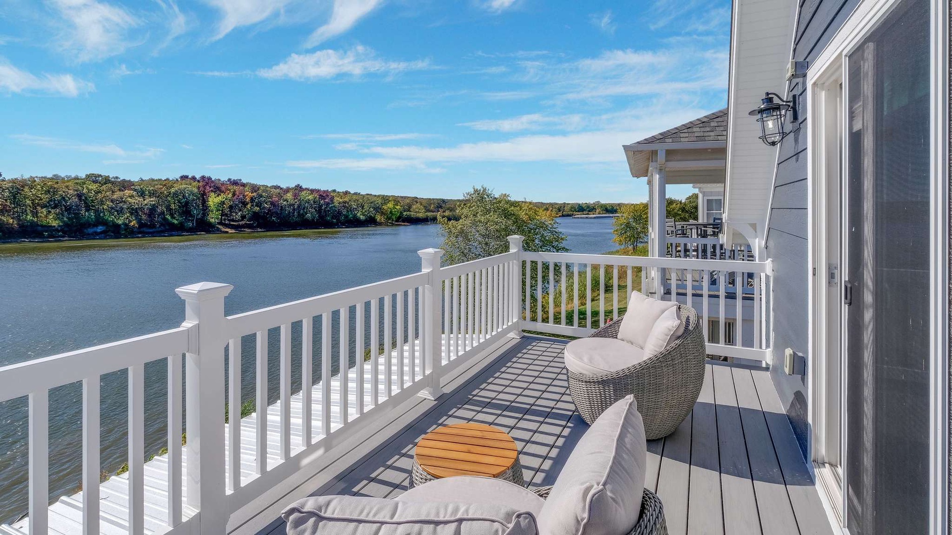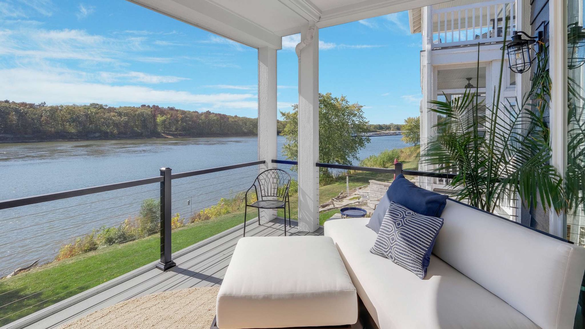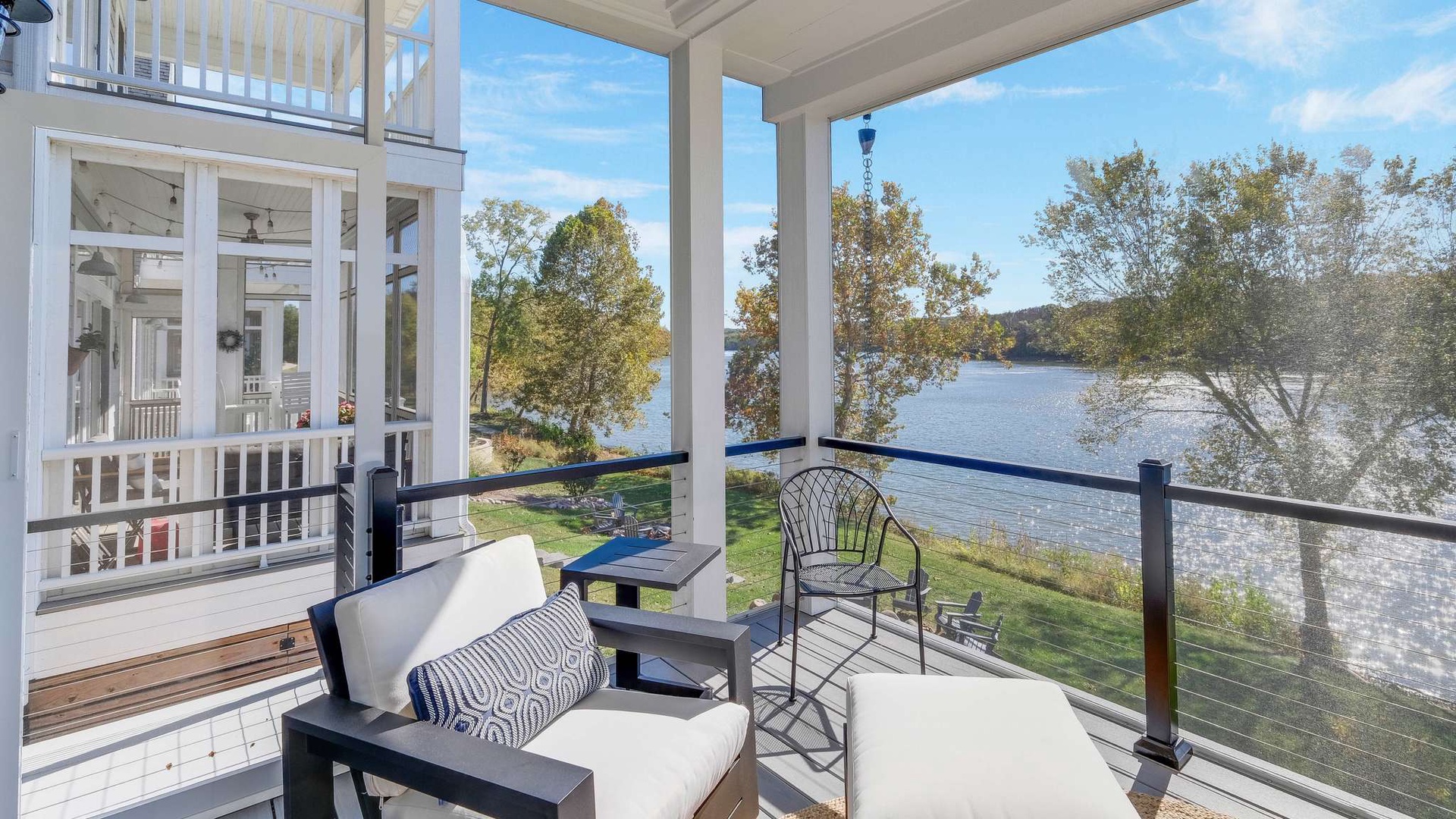 Just beyond, the screened-in porch offers an intimate spot to enjoy morning coffee or evening cocktails while overlooking the tranquil waters of the Illinois River.