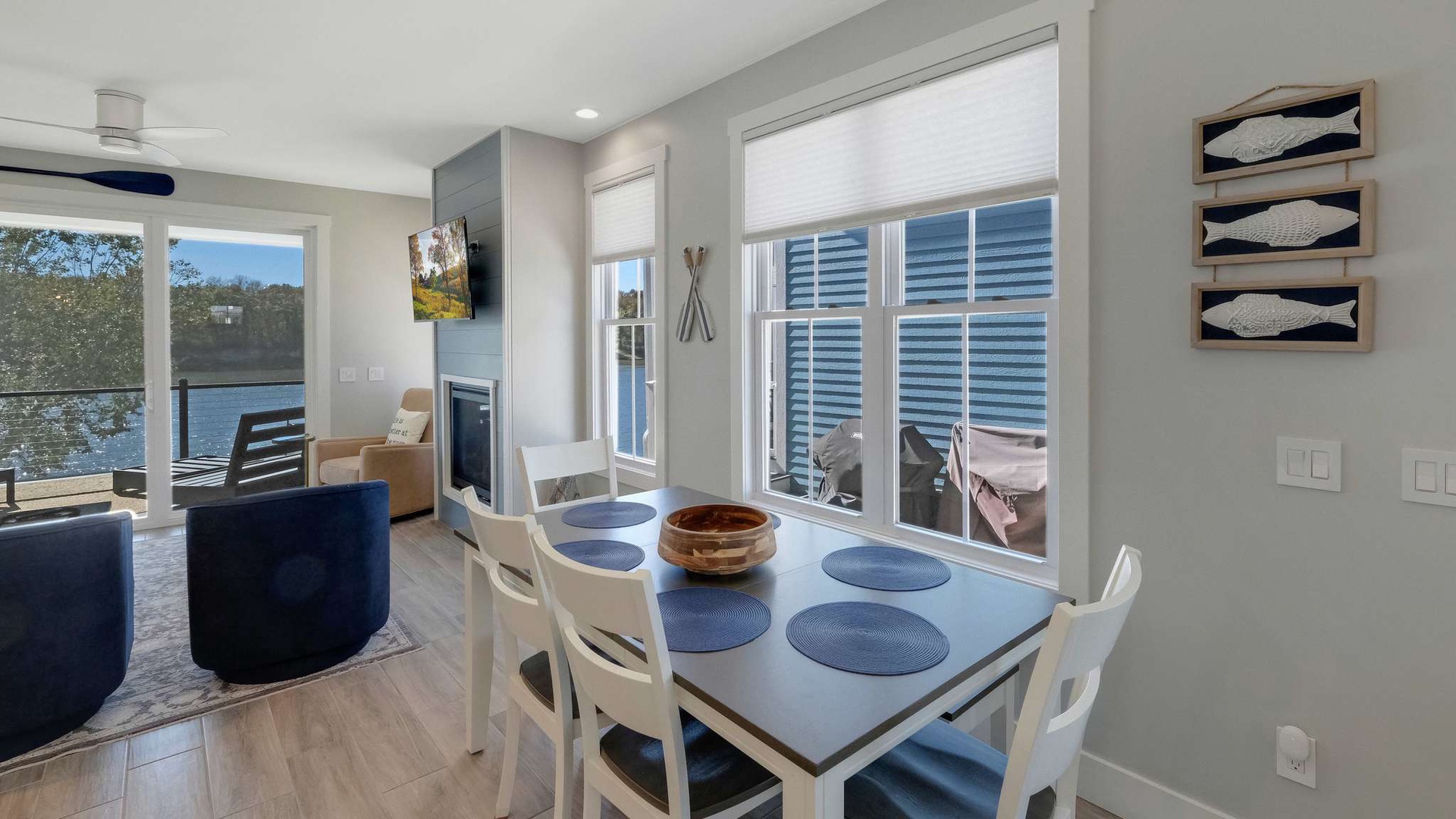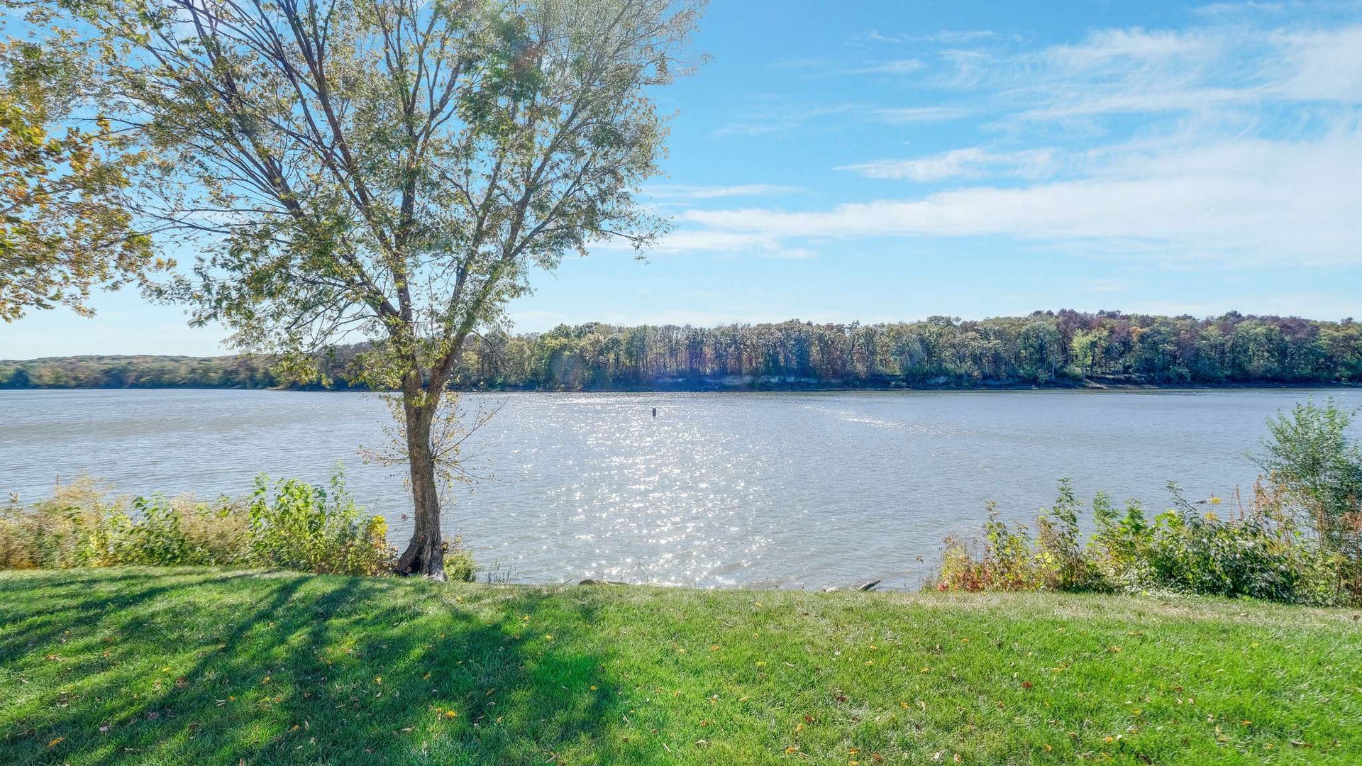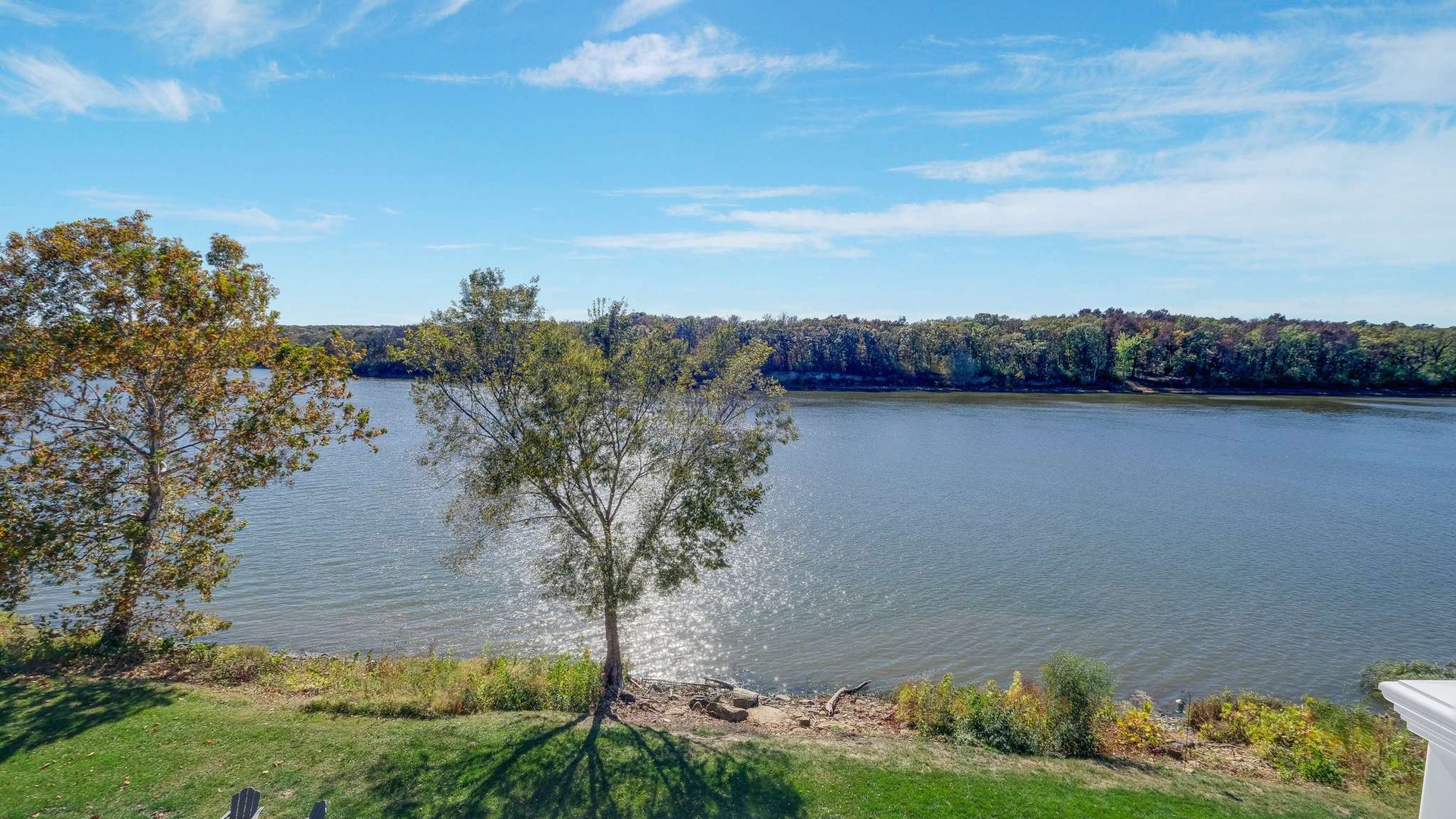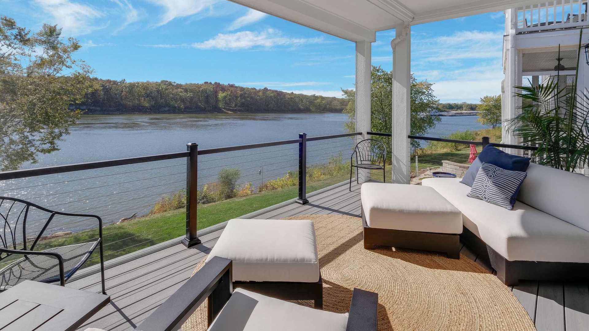 Just beyond, the screened-in porch offers an intimate spot to enjoy morning coffee or evening cocktails while overlooking the tranquil waters of the Illinois River.