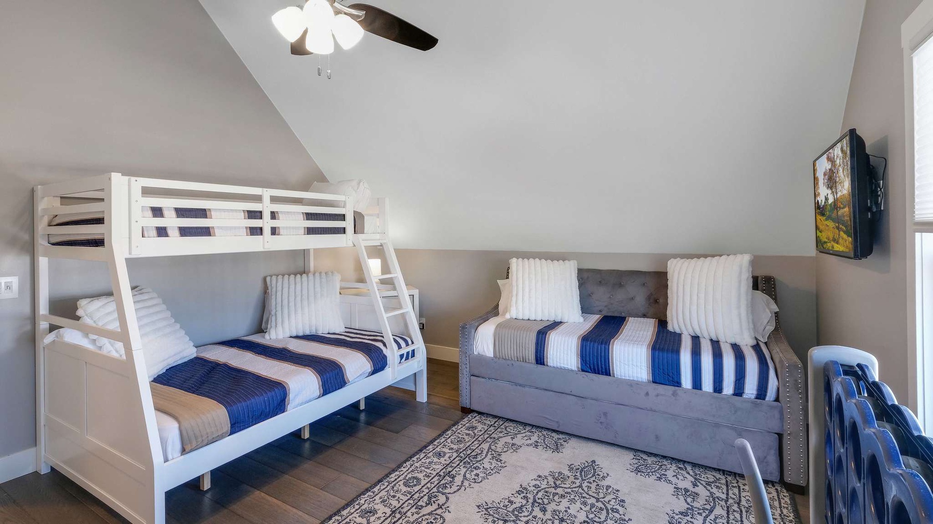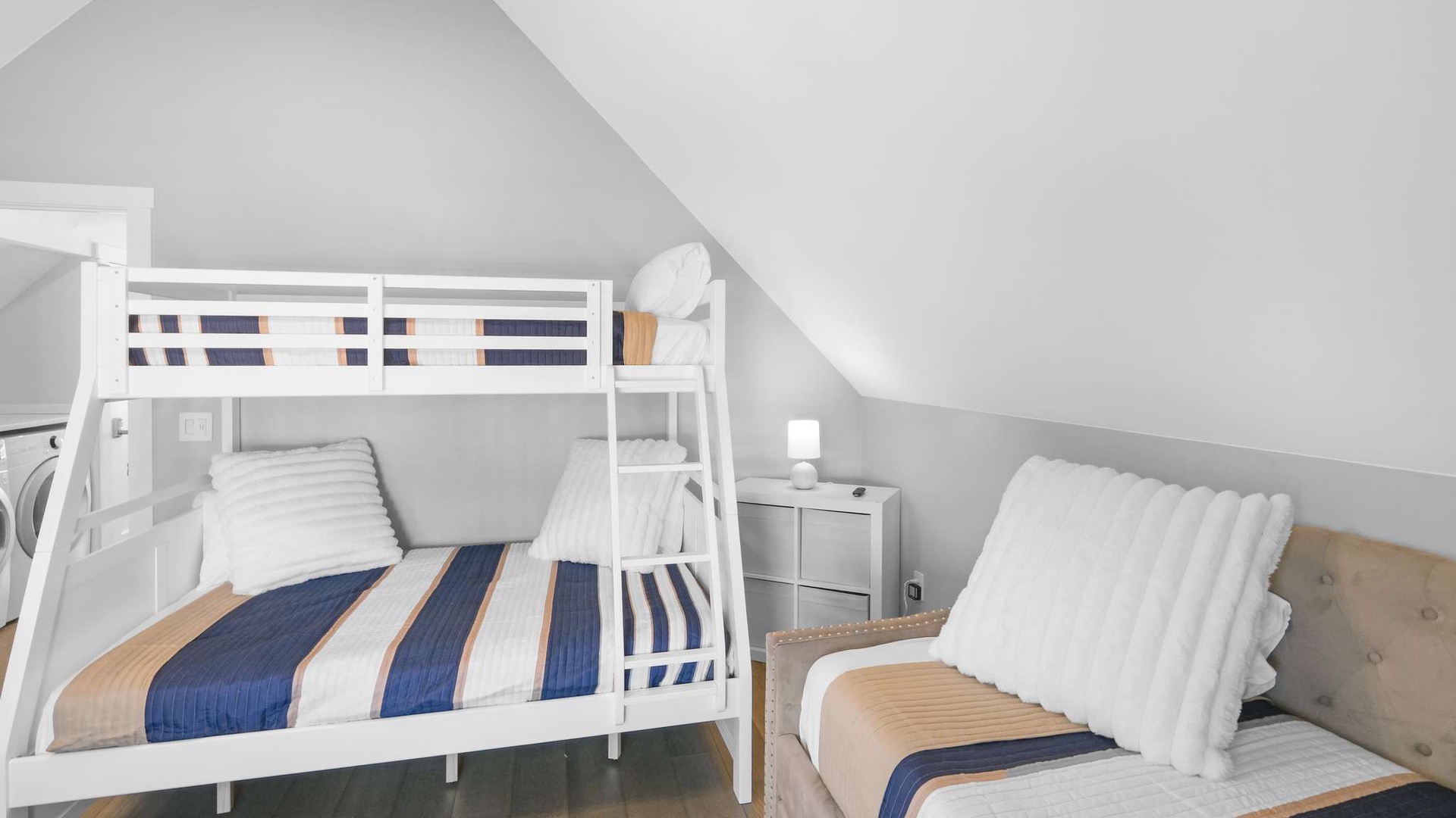 Second Bedroom: Twin-over-full bunk bed with a pullout twin trundle — perfect for families or guests seeking both flexibility and luxury. An ensuite bathroom offers a full tub/shower combination and designer finishes.