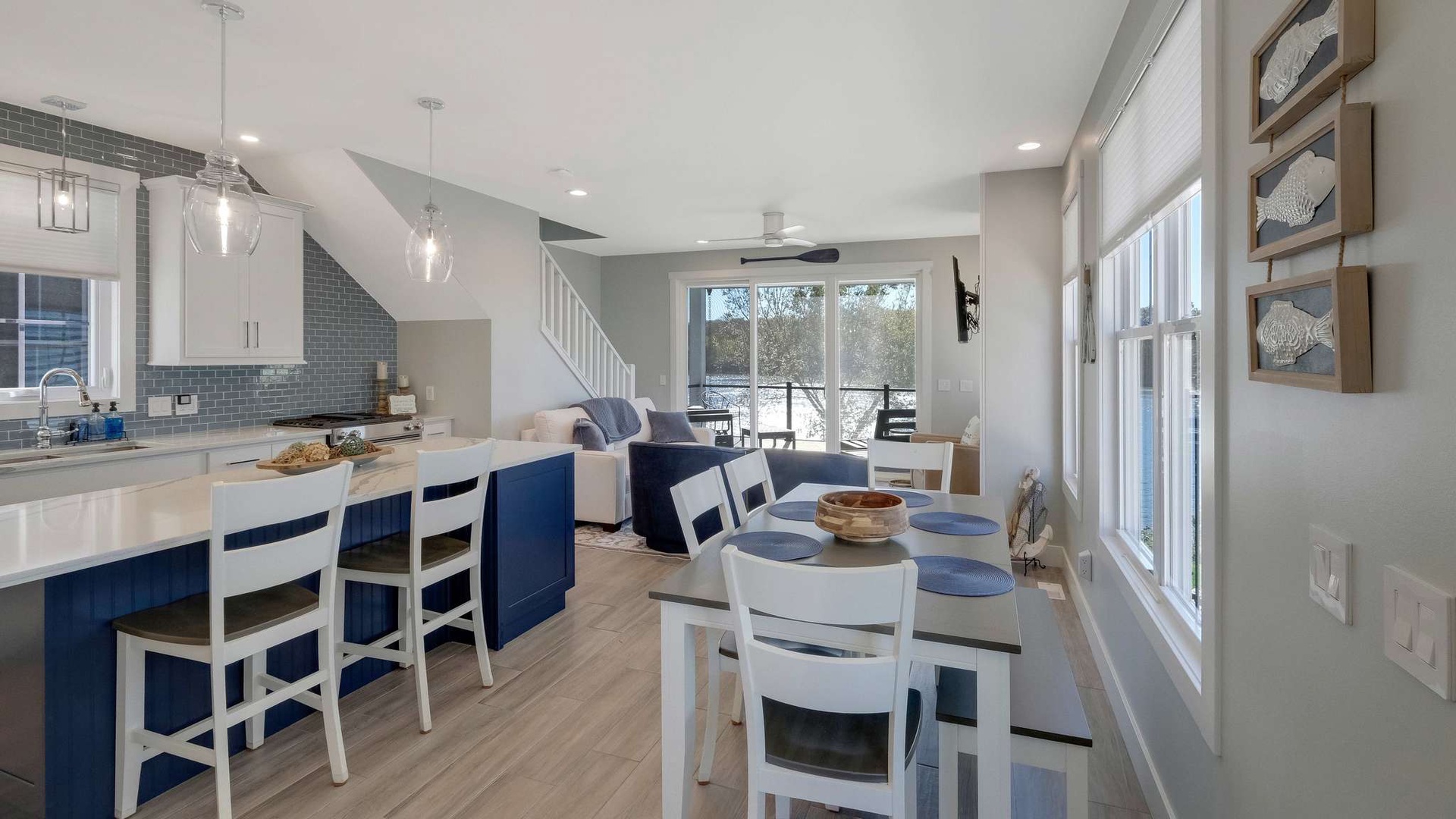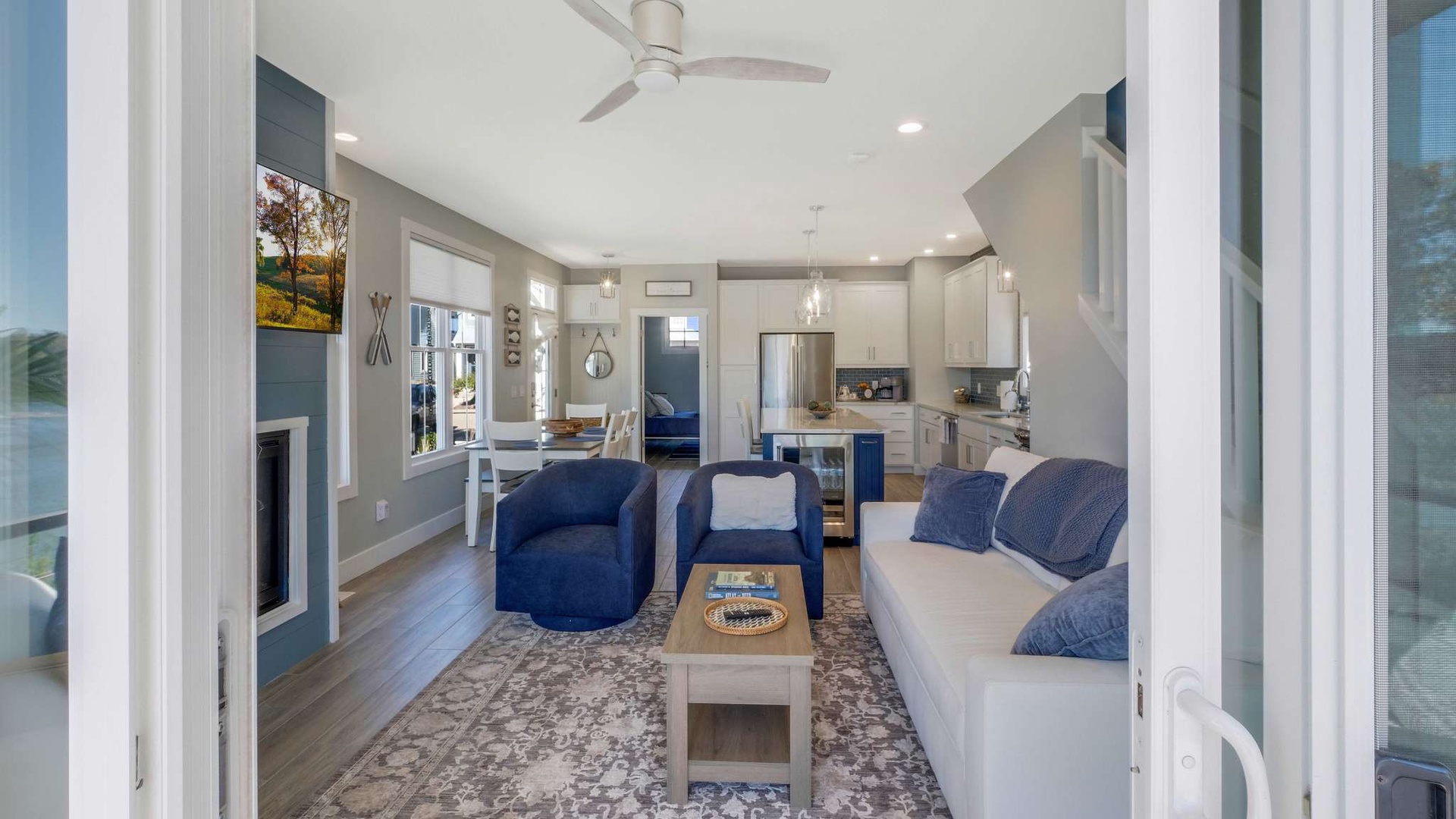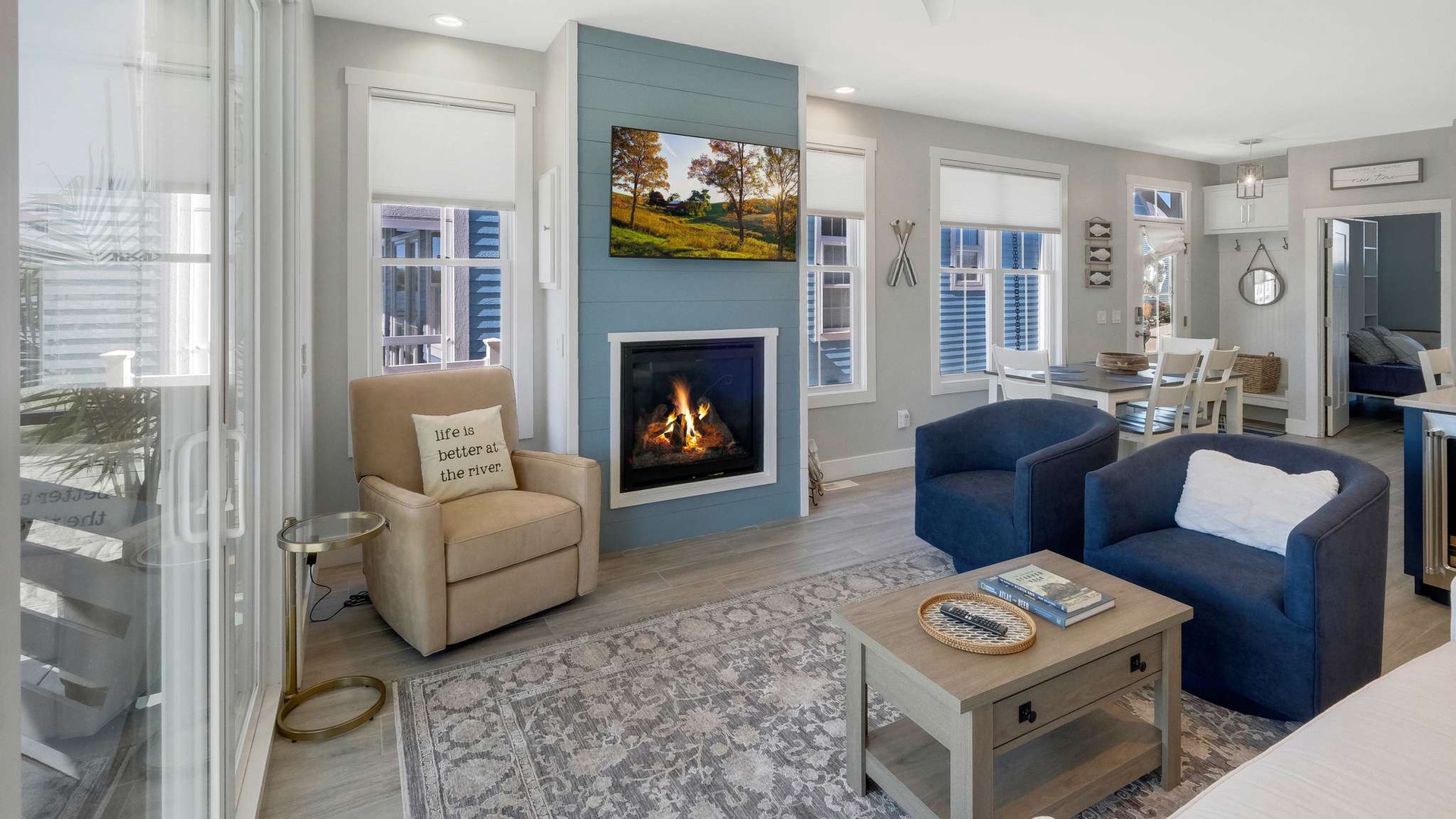 Step into an open-concept space where sophistication meets serenity. The designer kitchen boasts high-end appliances, a wine refrigerator tucked under the island, and beautiful quartz countertops that make entertaining effortless. The kitchen opens into an elegant living room featuring a modern fireplace, plush seating, and panoramic river views through expansive windows.