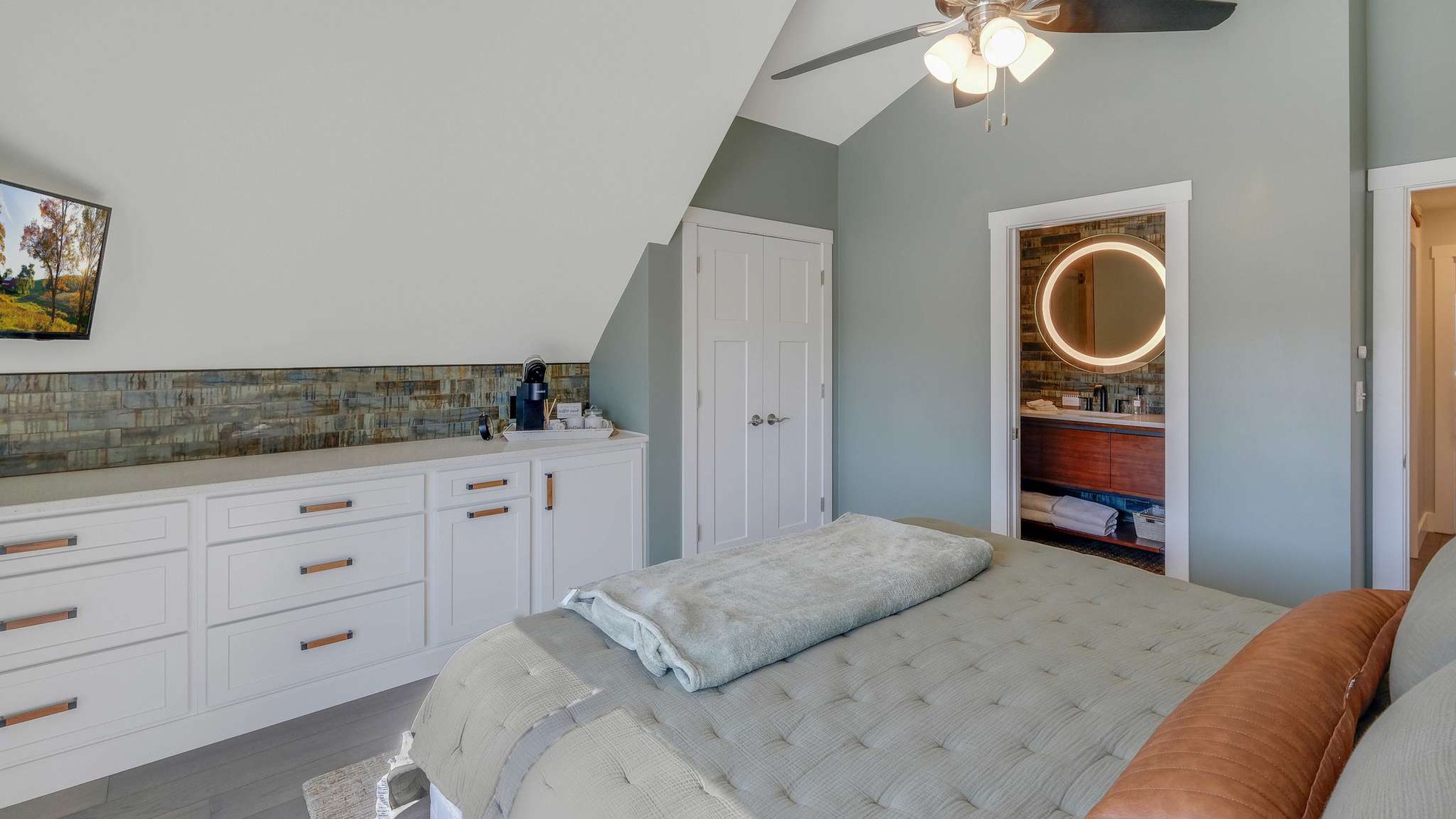 A queen bedroom with a full bathroom on this level provides convenience and privacy for guests who prefer main-floor accommodations.