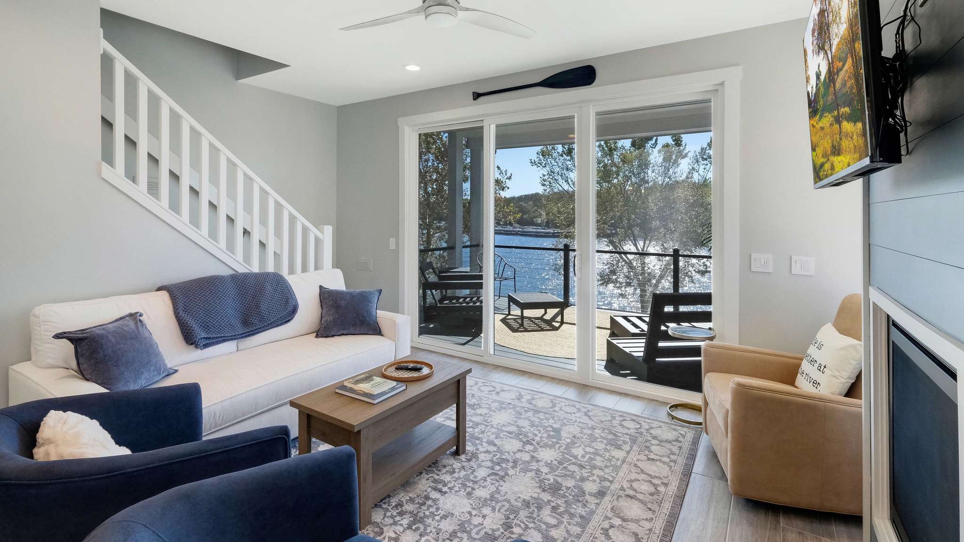 This 1,458 sq. ft. villa features 3 bedrooms, 3 full bathrooms, and comfortably sleeps up to 6 guests. Every space inside The Watermere has been thoughtfully designed for those who appreciate craftsmanship, comfort, and calm. With a screened-in porch overlooking the Illinois River, elegant gathering areas, and high-end finishes throughout, this villa defines refined waterfront living.