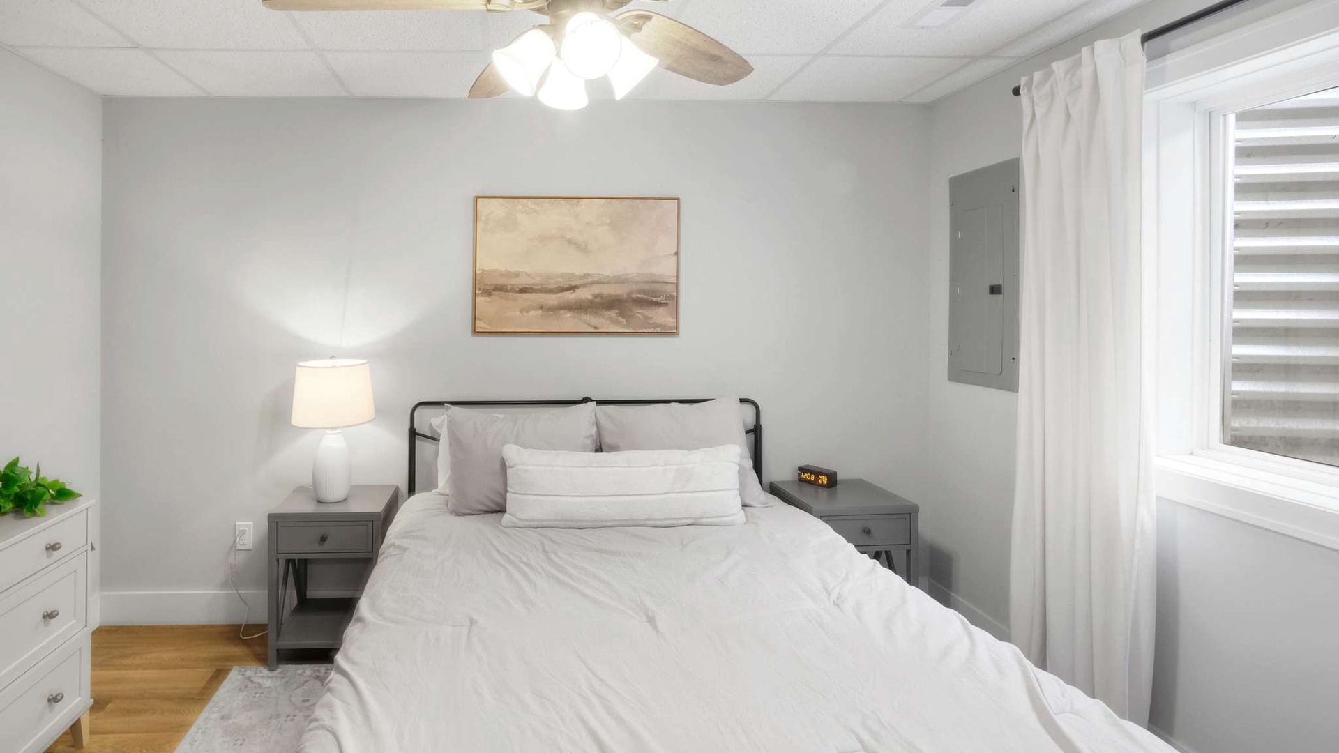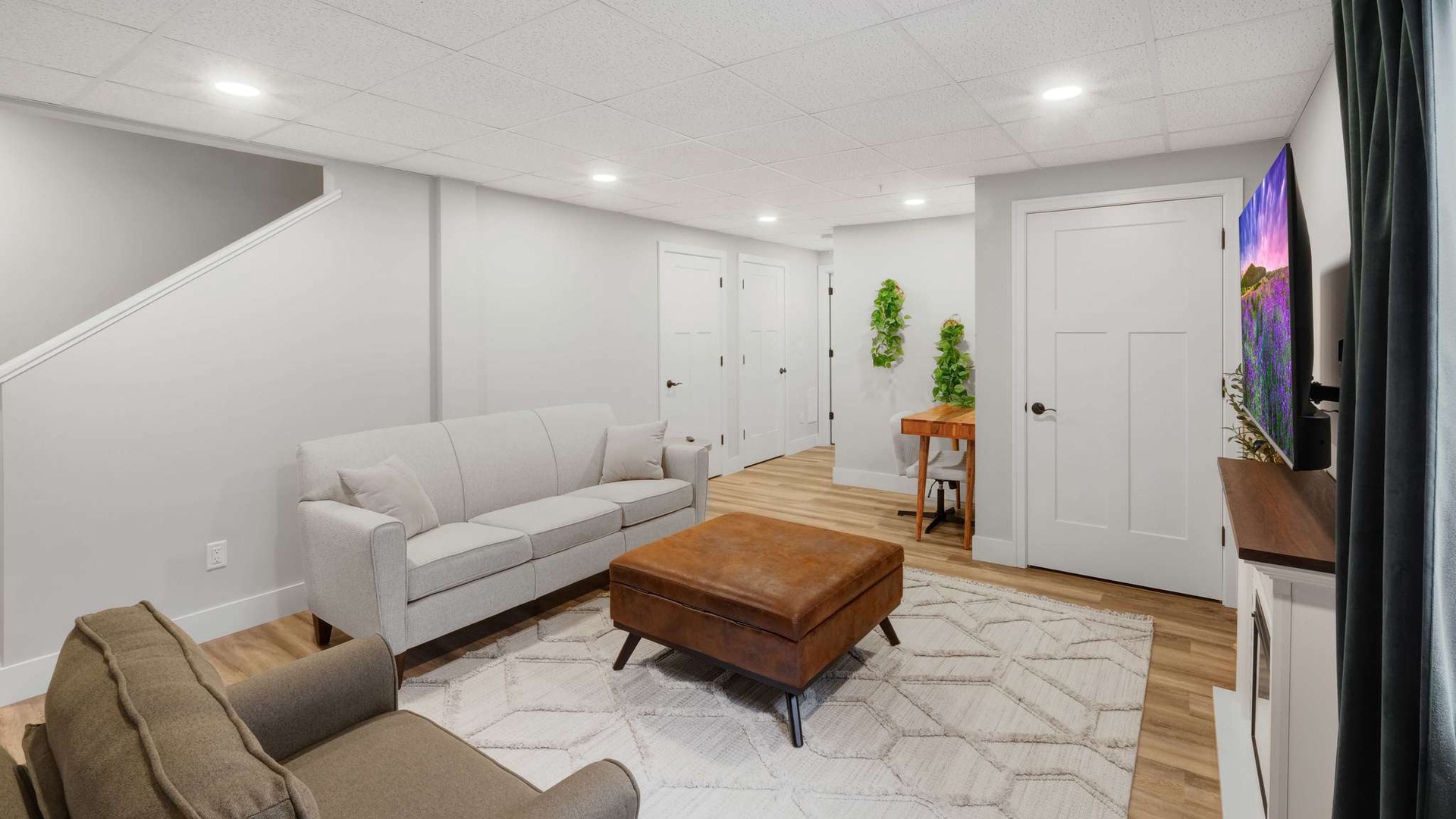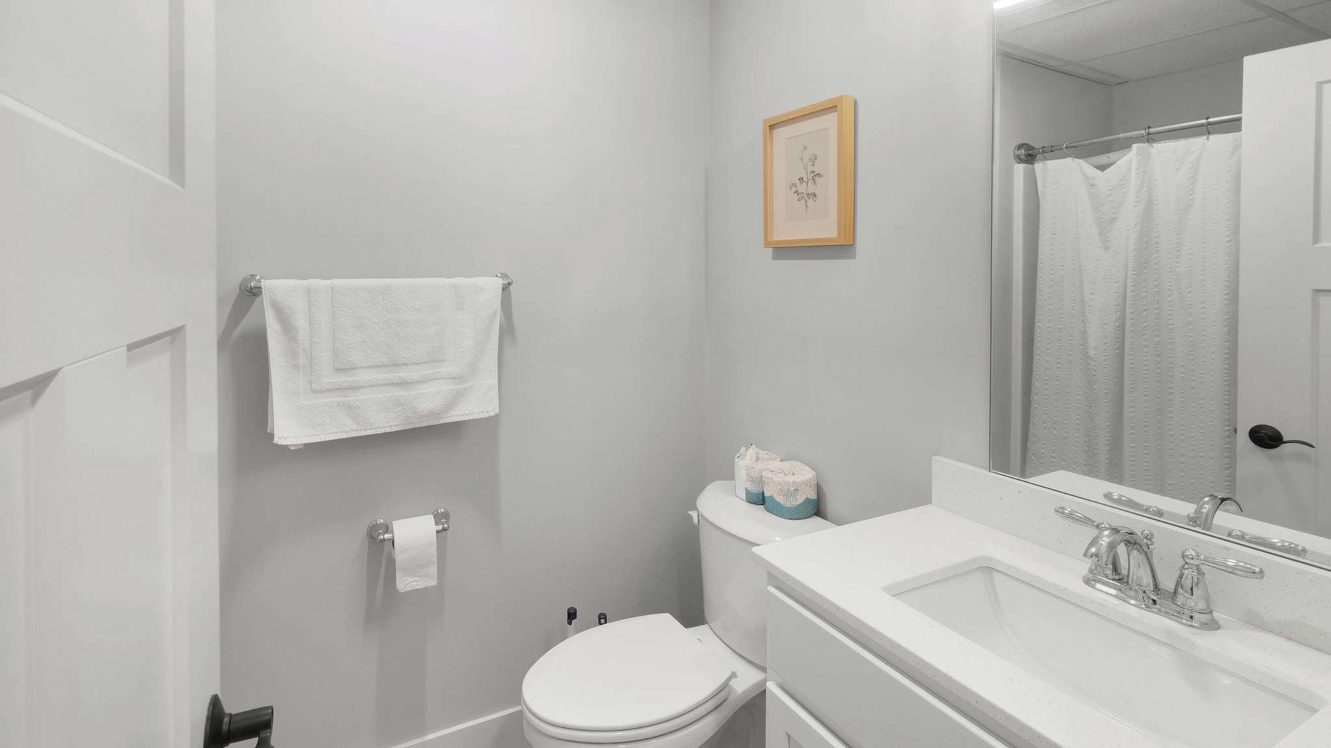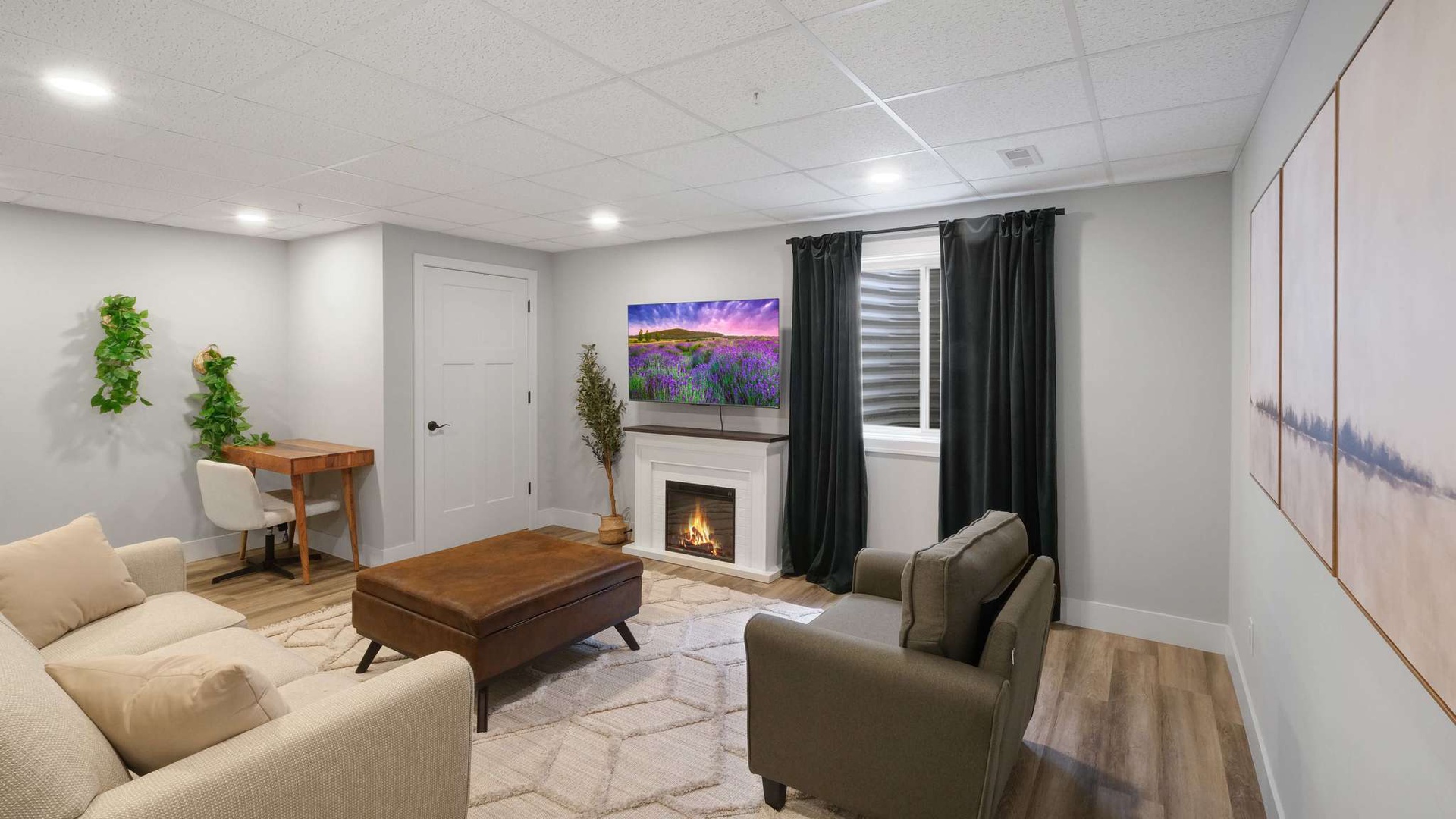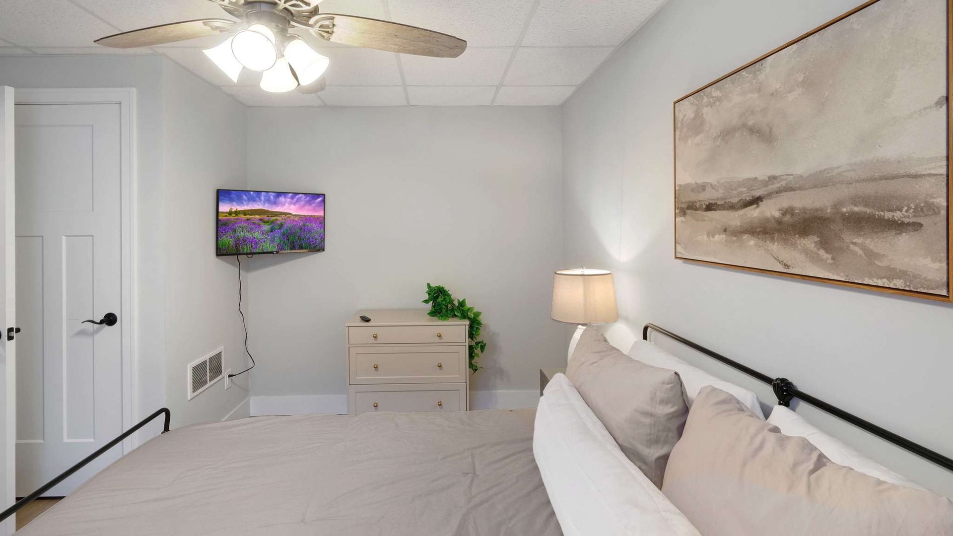 The finished basement offers a secondary living area and additional sleeping space. It includes a queen bedroom and a full bathroom, providing privacy and comfort for guests.