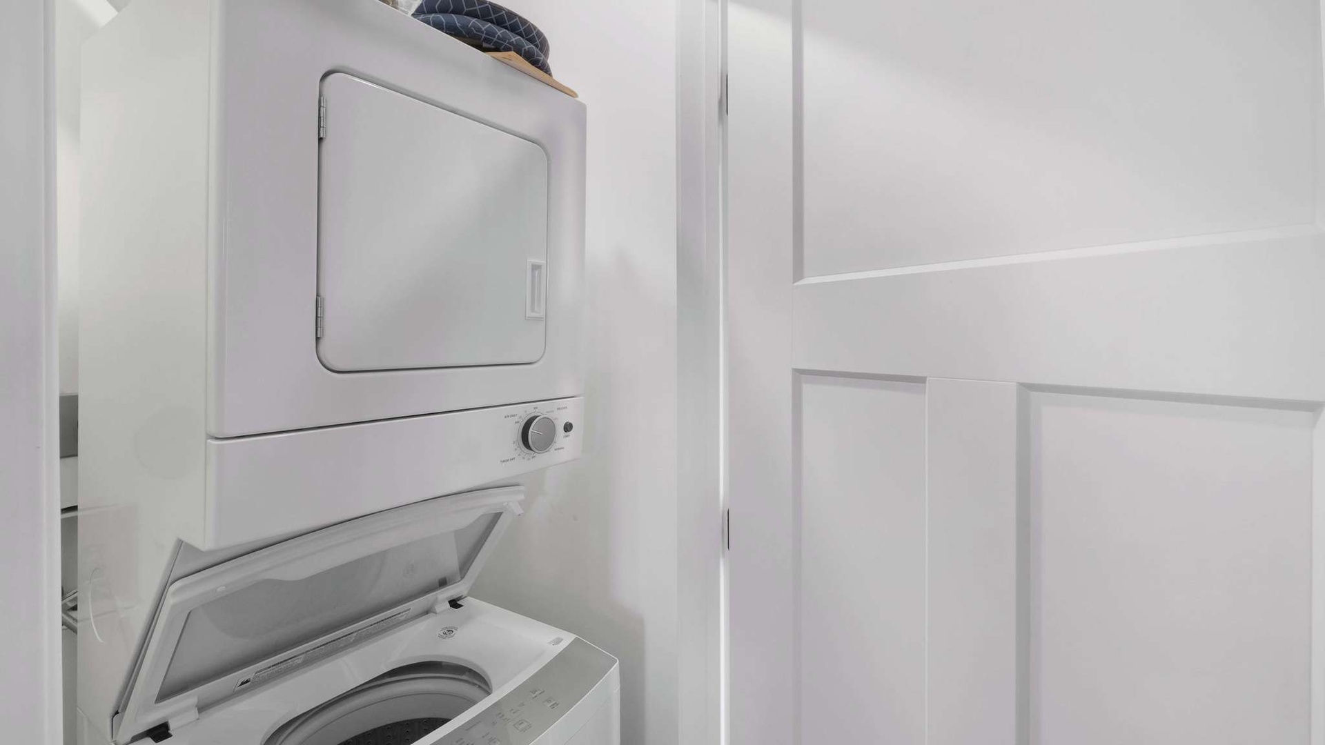 Also on this floor: Queen bedroom with walk-in closet and plush bedding Full bathroom with tub/shower combo Smart TV in living room Kitchen with modern appliances, cookware, and coffee maker Dining table for 4 Pull-out sofa in living room Washer and dryer