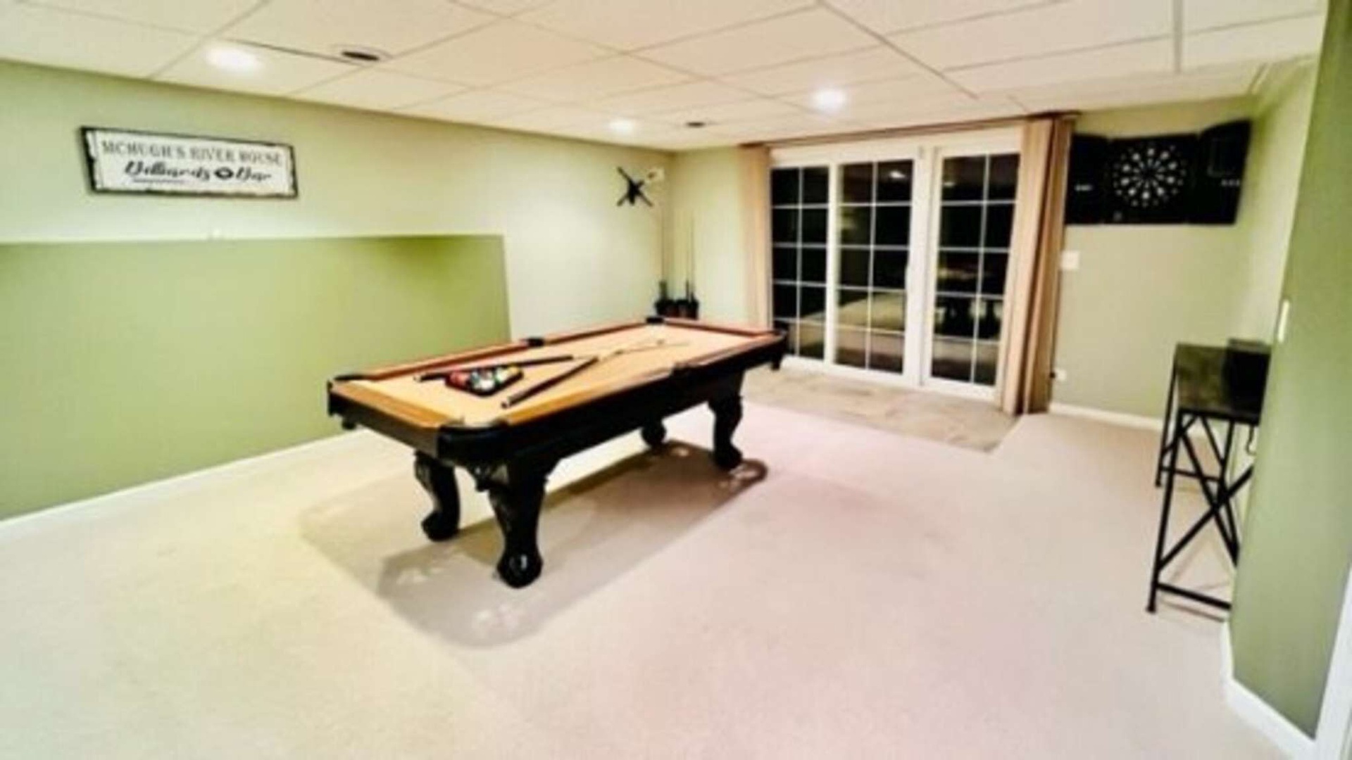 This beautiful home is 2 stories. The main level is comprised of a large front hall, opening into the living room, kitchen & dining area and Full bath. The first level also hosts one bedroom with two twin beds and the Master bedroom with a queen bed and bathroom ensuite. Laundry area is also located on this floor. The walk out basement is equipped with a bedroom with queen bed, a full bath and a game room. The game room consists of a grand flat screen tv, pool table and dart board.
